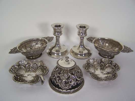 to include a silver mounted tortoiseshell inkwell, with applied foliate and scroll mounts and simple hinged domed cover, a pair of foreign twin handled dishes with Chester import marks; a pair of dwarf desk candle sticks; toast racks etc (qty)