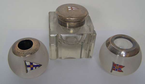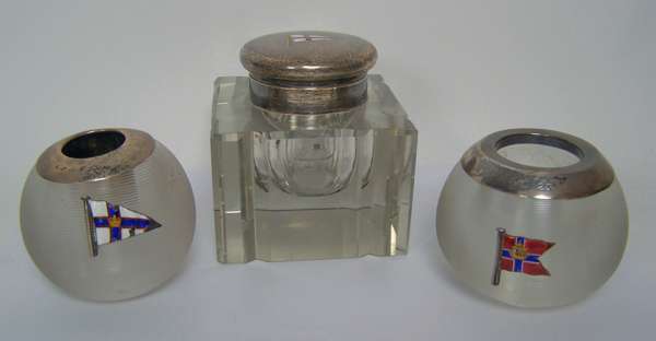 by Aidie Brothers, 1924, the square glass body with knotched detail, the simple hinged cover with enamel flag to centre; together with two ribbed glass vesta balls with simple collar mounts and applied enamelled flags to front (3)