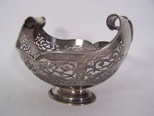 by Martin Hall & Company Sheffield 1922, of shaped oval outline with integral up turned scroll handles, the body with pierced and reticulated scroll and cross hatched designs, on domed foot