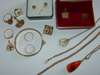 to include a 9ct gold foliate engraved hinged bangle; a 9ct gold mounted oval cut amber cabochon set ring; an oval cut tiger's eye cabochon set ring; two 9ct gold wedding bands; an initialled signet ring; a 9ct three-colour gold necklace and matching bracelet; a pair of 9ct gold engine turned square cufflinks; assorted earrings; brooches and other items (Qty)