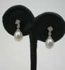 each composed of an off-set square cluster of four round brilliant cut diamonds, surmounting a millegrain collet set similarly cut diamond, suspending an ovoid cultured pearl drop with round brilliant cut diamond set cap, mount stamped 750