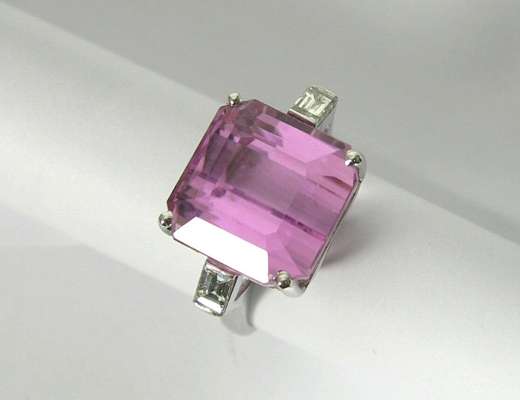 the central corner claw set fancy square cut kunzite, of a pleasing strong lilac hue, flanked to either side by a semi-channel set baguette cut diamond