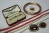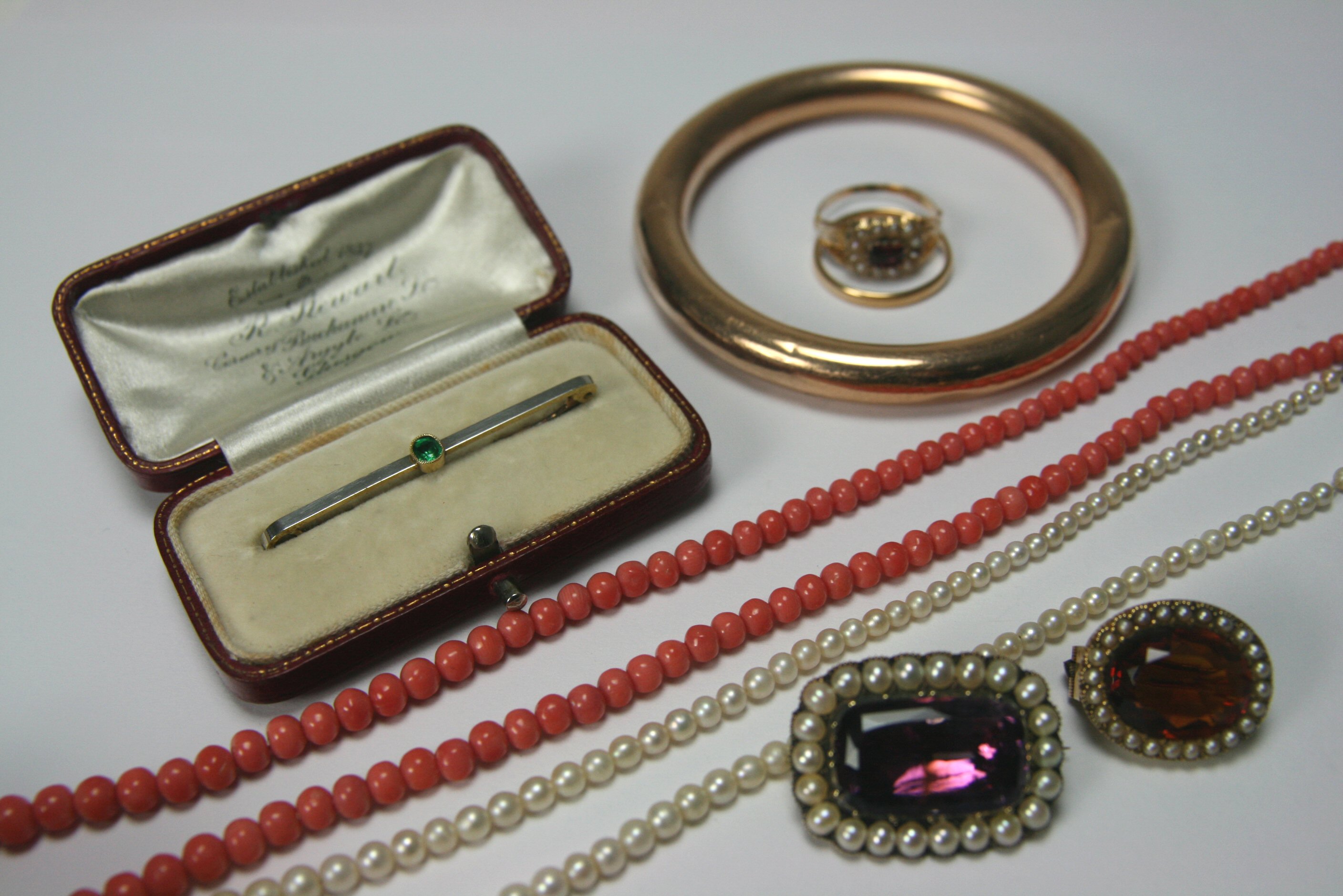to include an early 19th century amethyst and half-pearl set brooch; a similar citrine and half-pearl set brooch; a garnet and seed pearl set ring; an 18ct gold wedding band; a hollow swivel hinged bangle stamped 15; a composite gem set bar brooch; a coral bead necklace and a graduated cultured pearl nekclace (8)