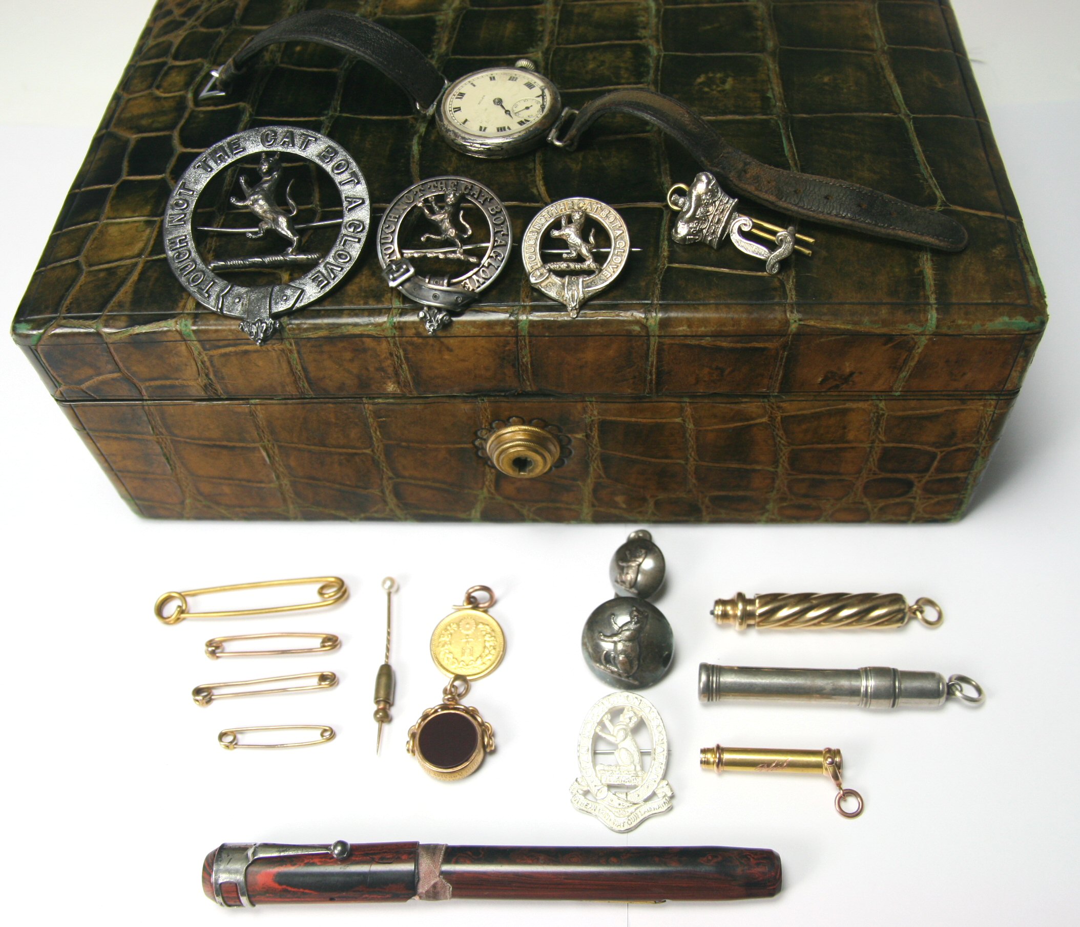 to include three assorted propelling pencils; a Blackbird fountain pen, with marbled wood effect casing and 18ct gold nib, inscribed MABIE TODD & CO LTD; a bloodstone set swivel fob; assorted pins; clan badges and a pendant mounted Eastern coin, contained in a crocodile leather jewellery box (Qty)