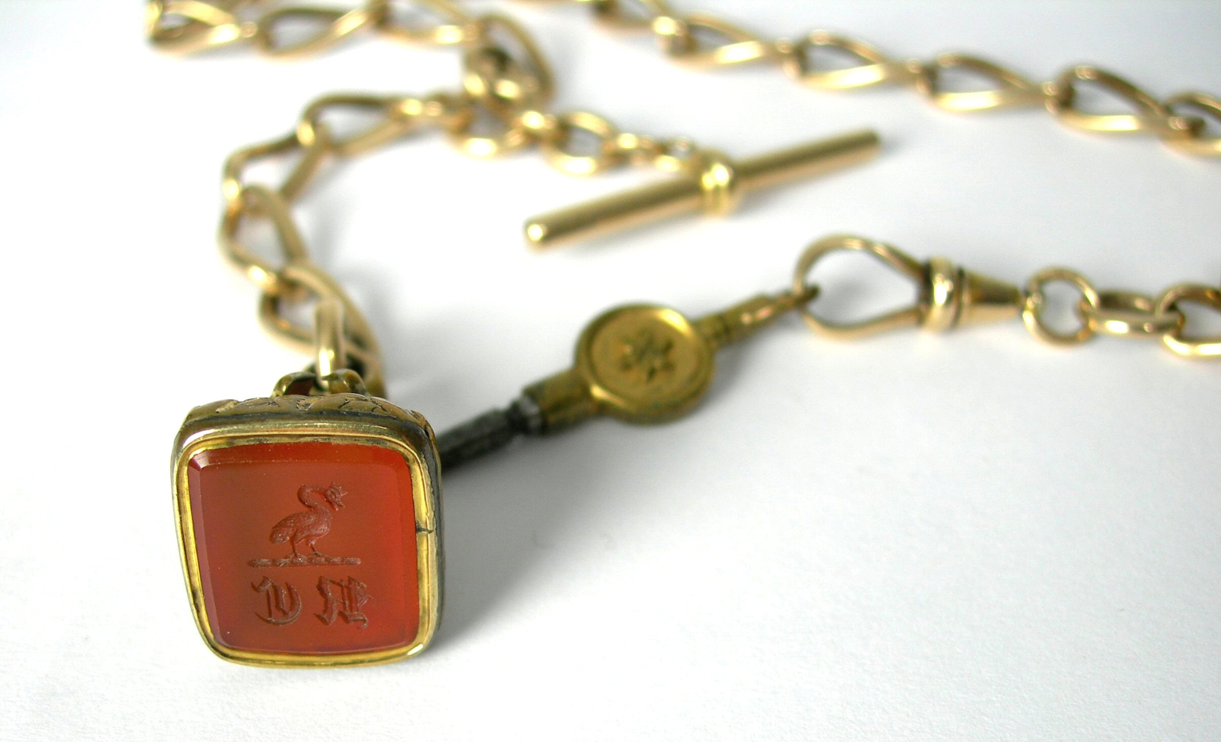 composed of oval curb links, with T-bar, watch key and intaglio fob suspensions