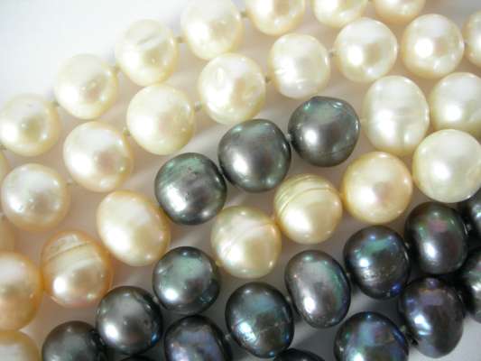 composed of uniform off-round pearls, measuring approximately 9mm diameter; a similar dark grey freshwater cultured pearl necklace; together with a multi-coloured freshwater cultured pearl necklace (4)