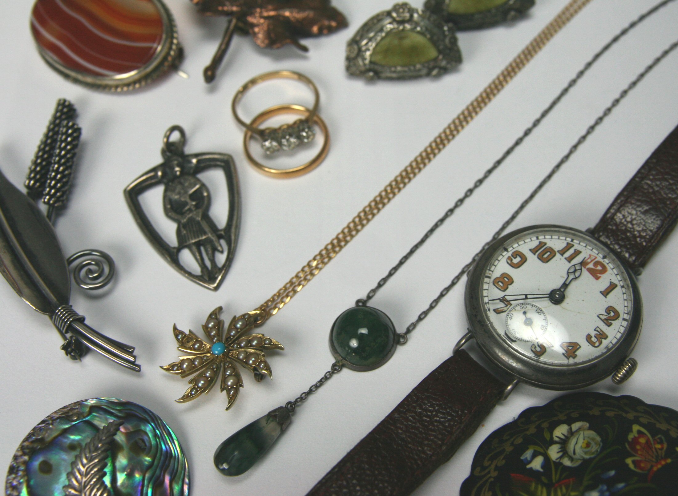 to include an 18ct gold and platinum mounted three-stone diamond ring; an 18ct gold wedding band; a lady's gold wrist watch; a 15ct gold mounted turquoise and seed pearl set star form pendant with chain; an Iona silver pendant; a moss agate set necklace, stamped 800; an early 20th century silver wrist watch with leather strap; together with a collection of mostly costume jewellery
