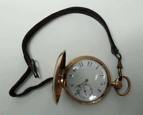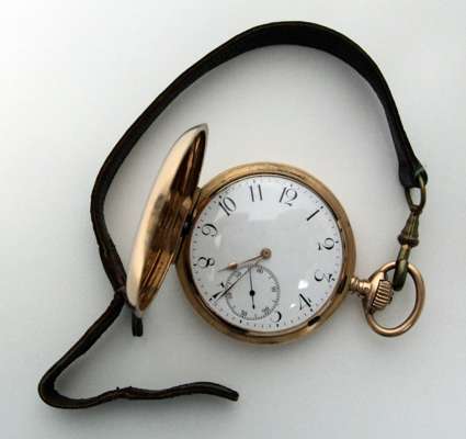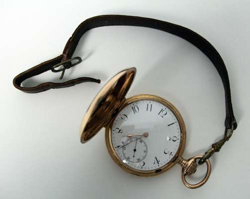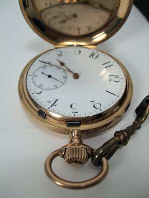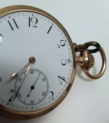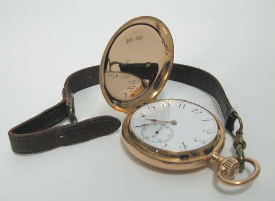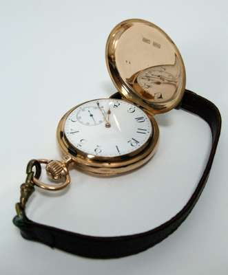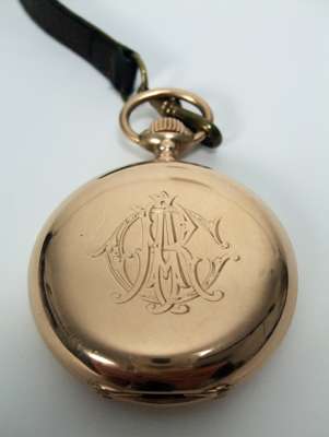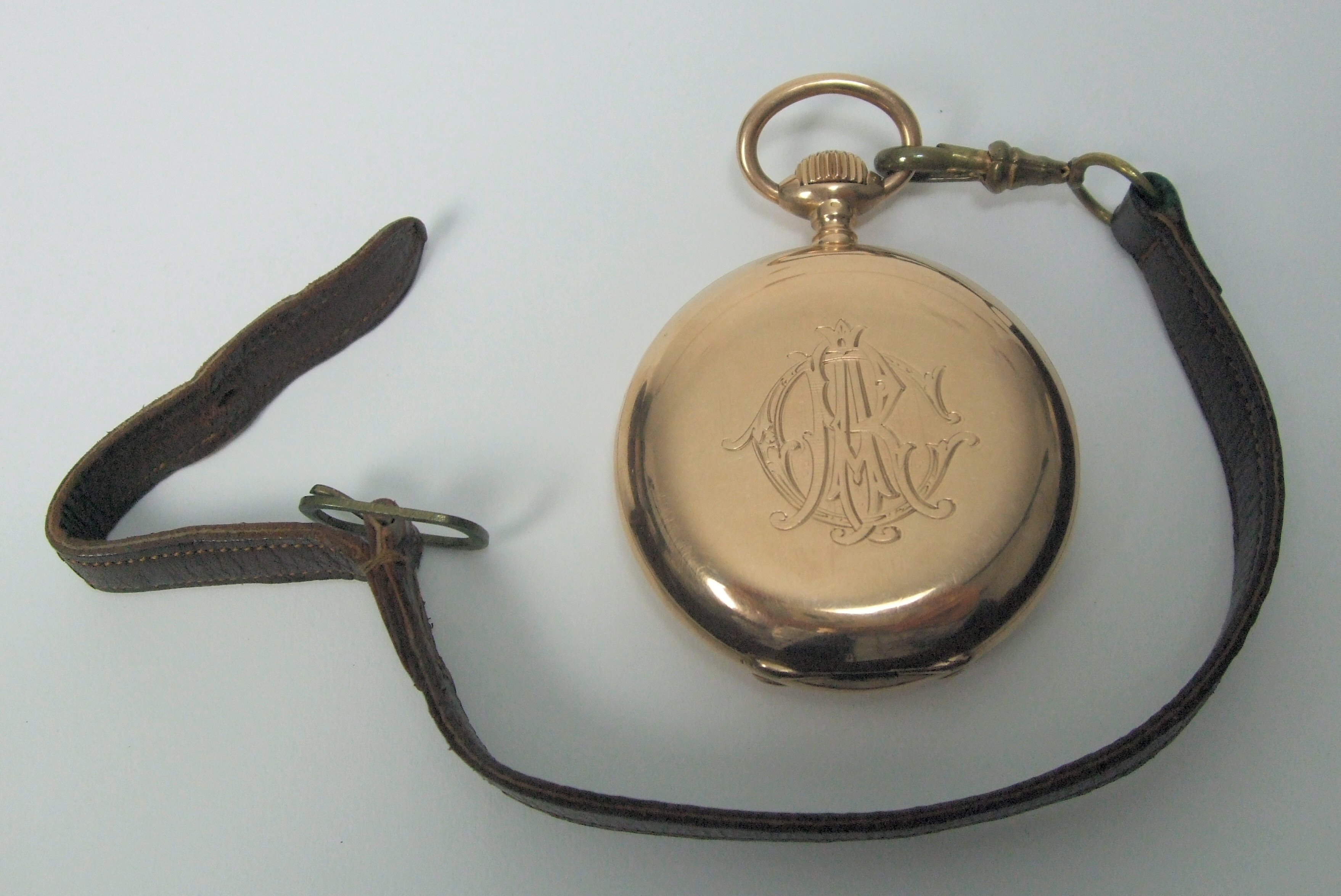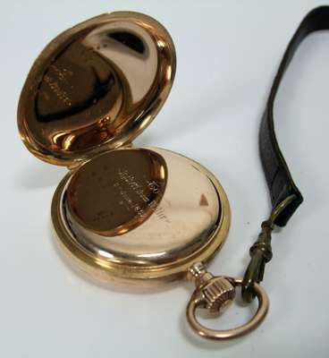 the white enamel dial with black Arabic numerals and gold hands, with subsidiary seconds dial and keyless wound lever movement, signed R. STEWART ... GLASGOW, the cuvette inscribed TO ROBERT FROM WILLIE 9TH JUNE 1892, case monogrammed