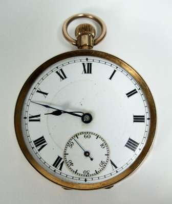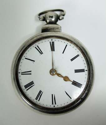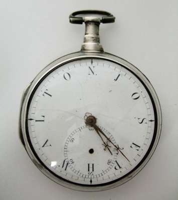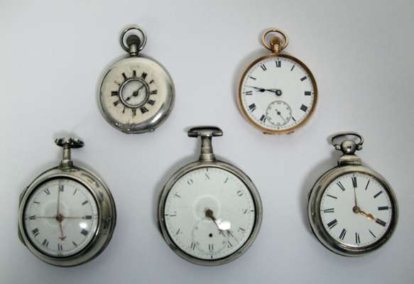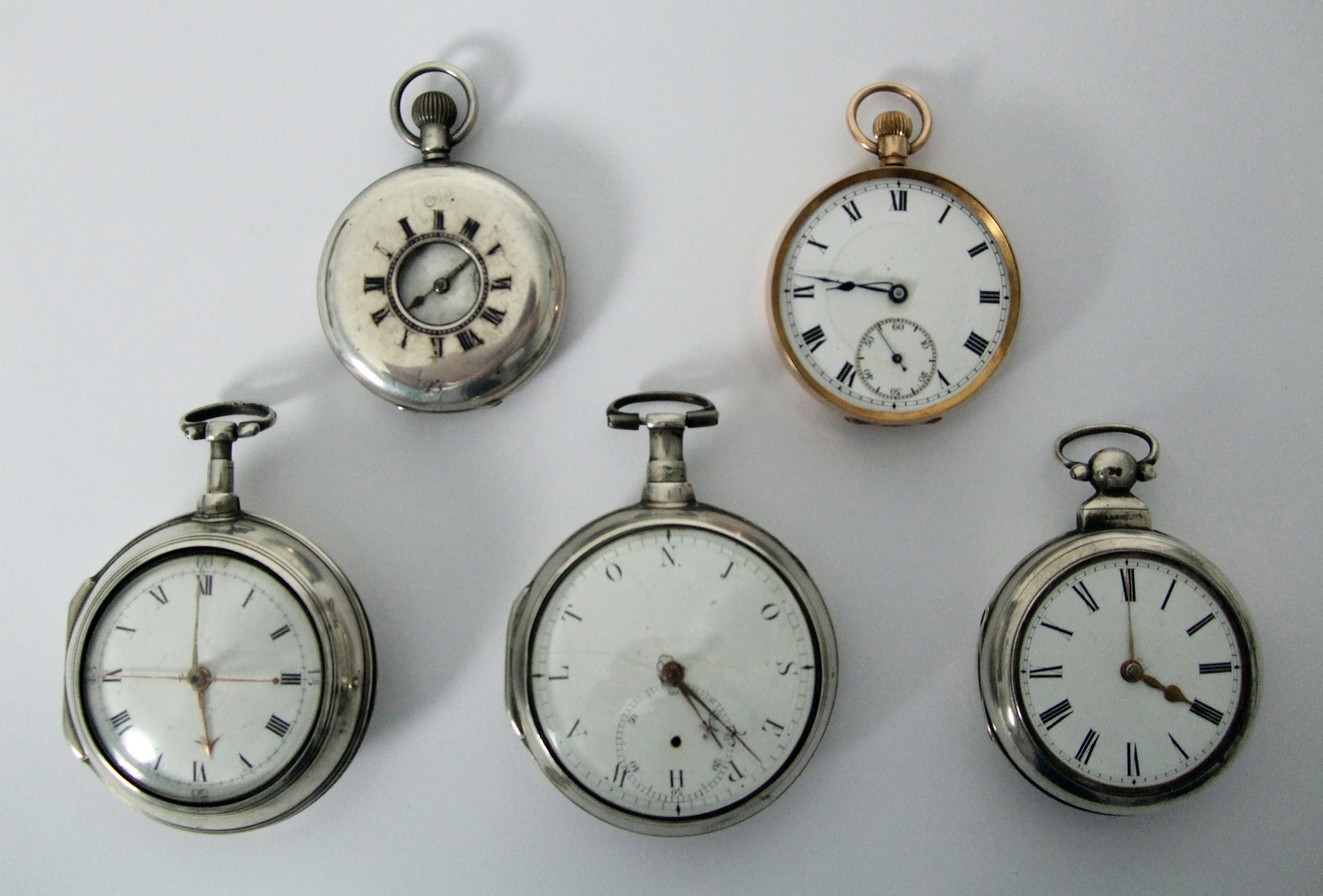 the first of large size, the circular enamel dial with 'JOSEPH WALTON' for the numerals, subsidiary seconds hand, the verge movement inscribed M Tobias and Co. London; another by Robert Ray Liverpool; another by J Ellard Stockingford; and a 9ct gold cased keyless wind open faced pocket watch; a plain silver csed demi-hunter cased pocket watch (5)