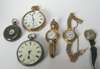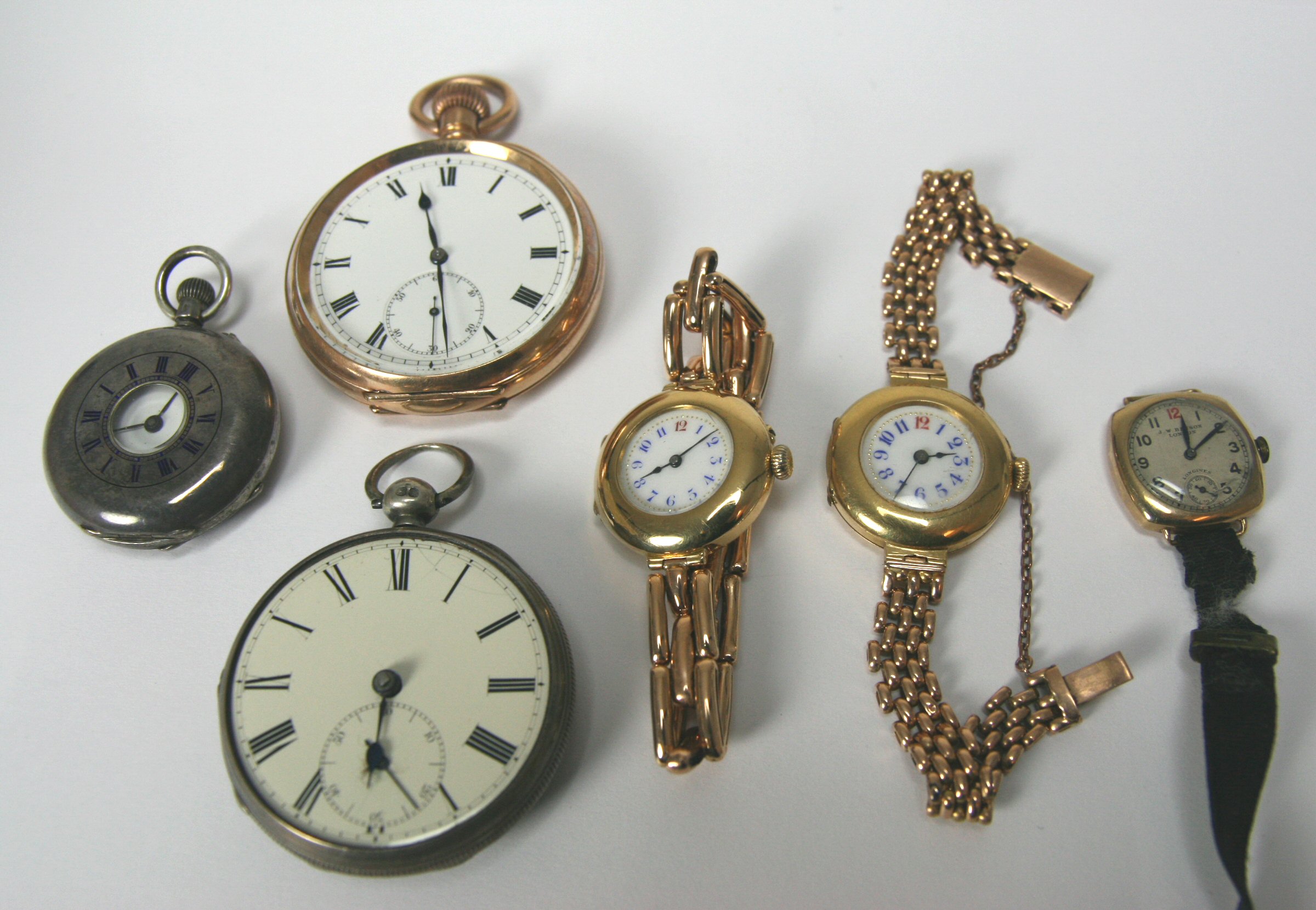 the white enamel dial with red and blue Arabic numerals, with later 15ct gold brick link bracelet; a similar 18ct gold lady's wrist watch; another lady's gold wrist watch, dial signed J.W. BENSON and LONGINES, with black moire ribbon strap; together with three assorted pocket watches (6)