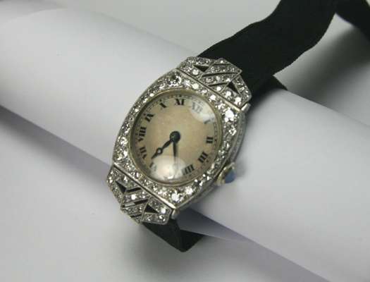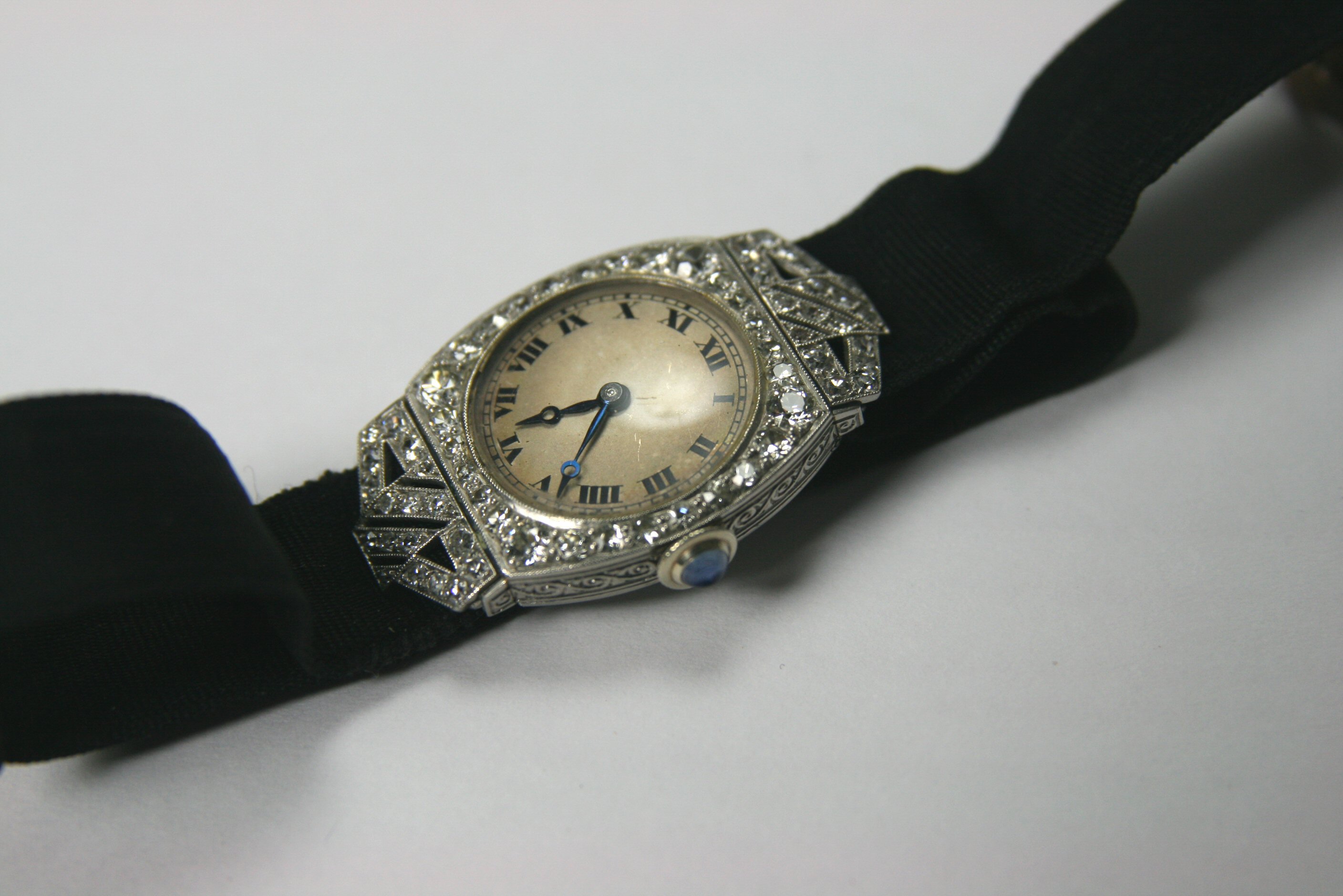 the silvered circular dial with black Roman numerals and hands, the bezel set with brilliant and single cut diamonds, the shoulders of pierced geometric design, also diamond set, with blue cabochon set winder and black moire ribbon strap