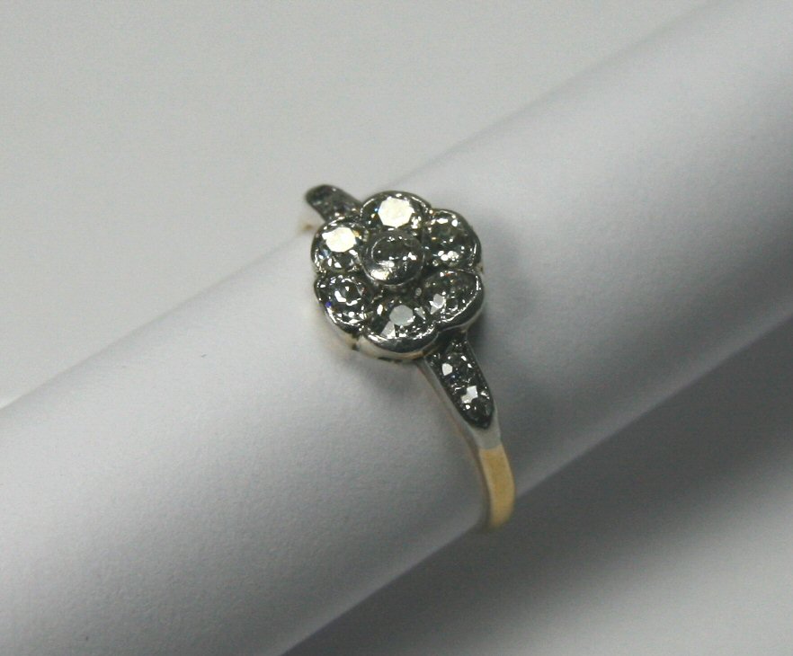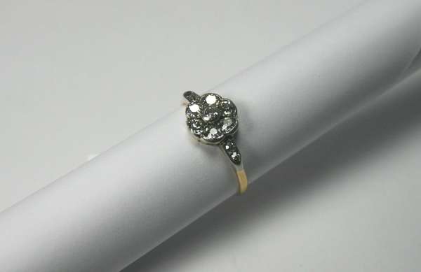 the central collet set old European cut diamond within a surround of six similarly cut diamonds, flanked to either shoulder by two single cut diamonds, mount unmarked (tests as gold)