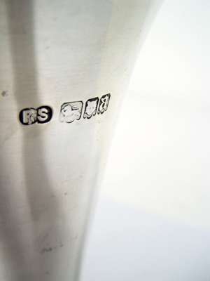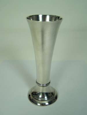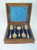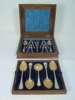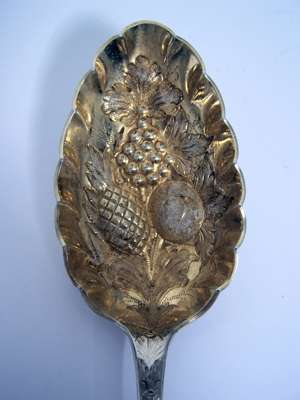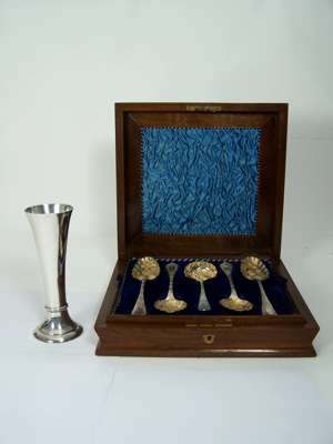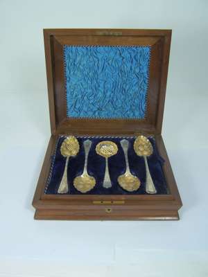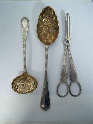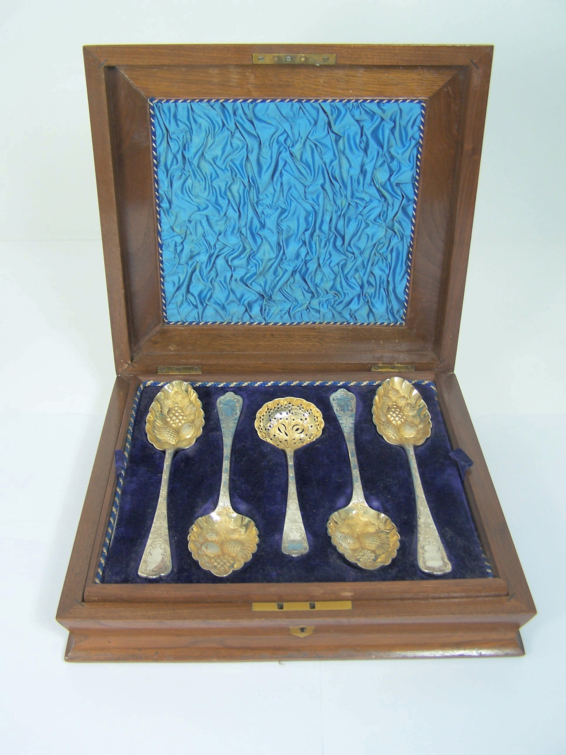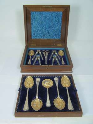possibly by Harrison Bros and Howson, circa 1880, comprising six berry spoons, chased and gilt with a sugar sifter ensuite in a lift out tray and a set of four nutcrackers below with a pair of grape scissors; together with a silver spill vase, London 1916, of plain tapering form, spreading base, 19cm high