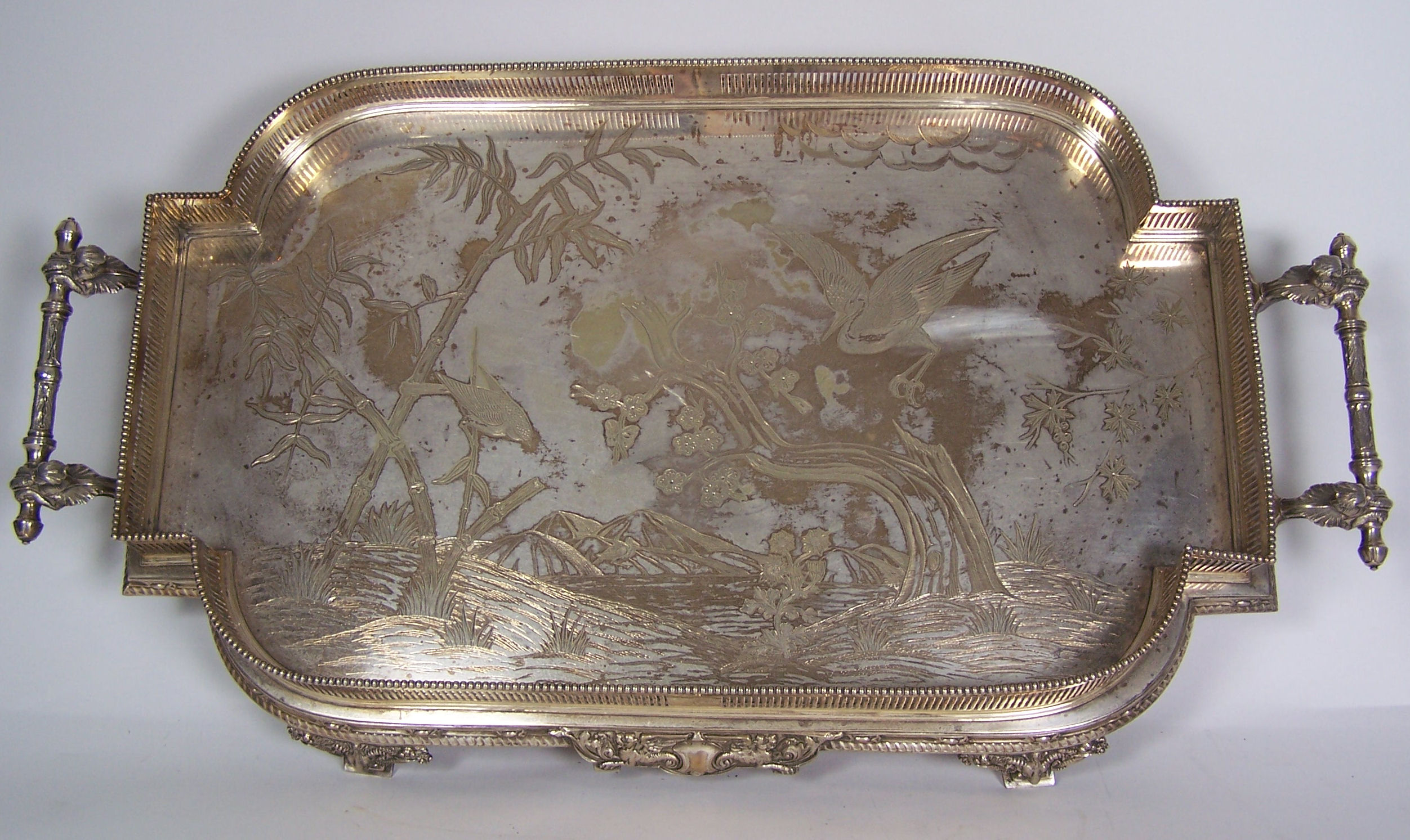 of shaped rectangular outline with stepped base with fluted border and on rams head figural bracket feet, with reticulated gallery with beaded rim, the flat engraved with oriental engraved scene of cranes in a landscape with bamboo and foliage, with twin carrying handles supported by figural mounts and with foliate detail