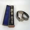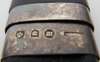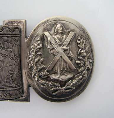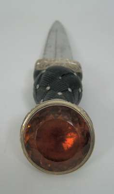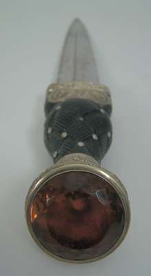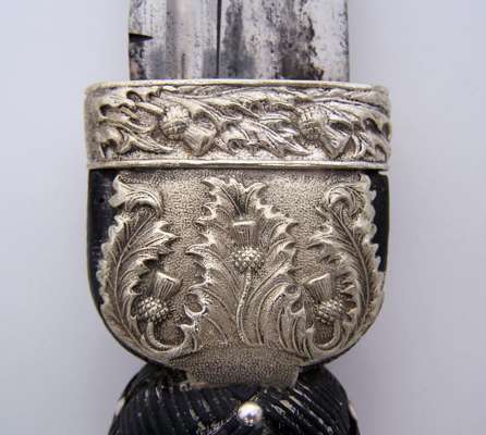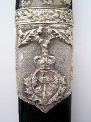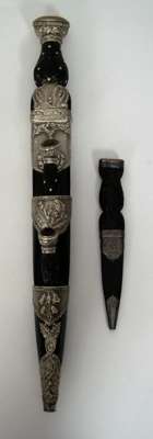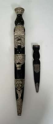 the dirk with plated white metal mounts with heavily embossed thistle decoration, the carved handle with collet set paste to pommel, the scabbard set with bi knife and fork, in original case with Victorian sgian dubh, Edinburgh 1893 (makers mark indistinct), simple carved handle with collet set paste to pommel, the scabbard with silver mounts and engraved crest; together with a silver bullion dress belt and dirk frog