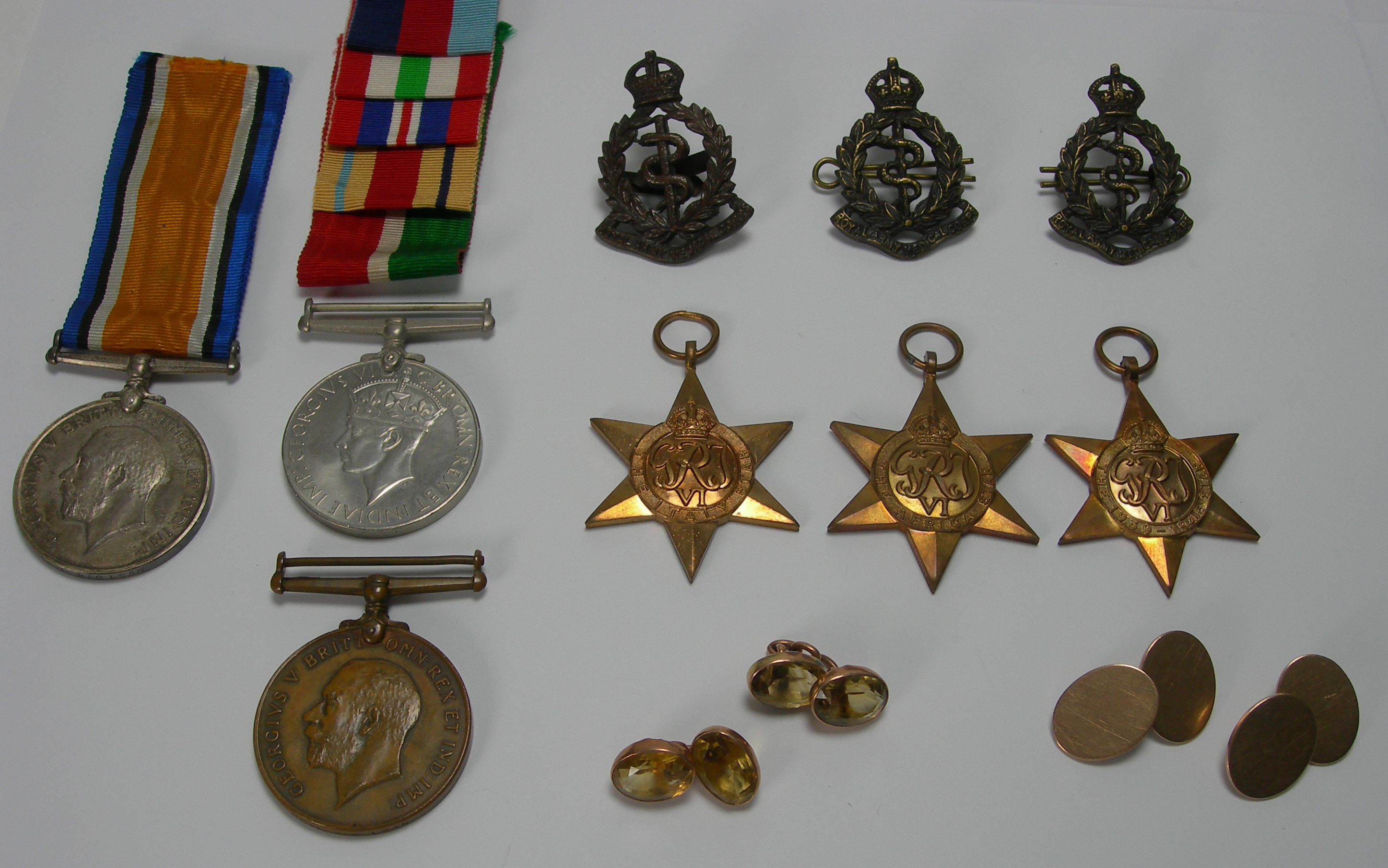 believed awarded to Neil Maclean RAMC, 1914-18 BWM, Mercantile Marine War Service medal, 1939-45 BWM, 1939-45 star, Africa star, Italy star, with a loose 1st Army bar, three RAMC badges and cloth badges, a pair of plain 9ct gold cufflinks, a pair of gold and citrine cufflinks (qty)