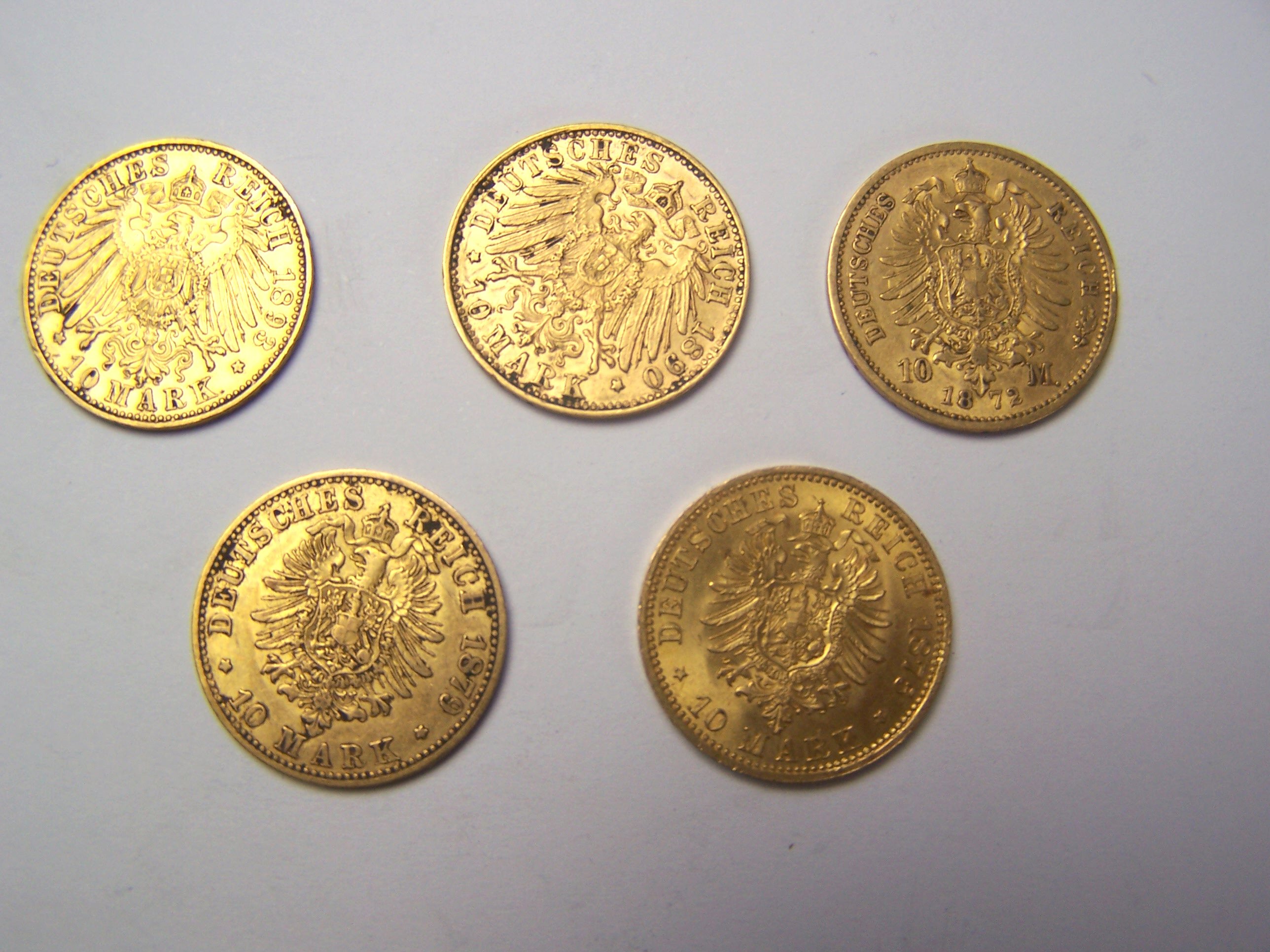 to include 1872 10 Marks, A below bust GF; 1875 10 Marks, A below bust EF; 1879 10 Marks, A below bust VF; 1890 10 Marks, D below bust, GF; 1893 10 Marks, A below bust GF (5)