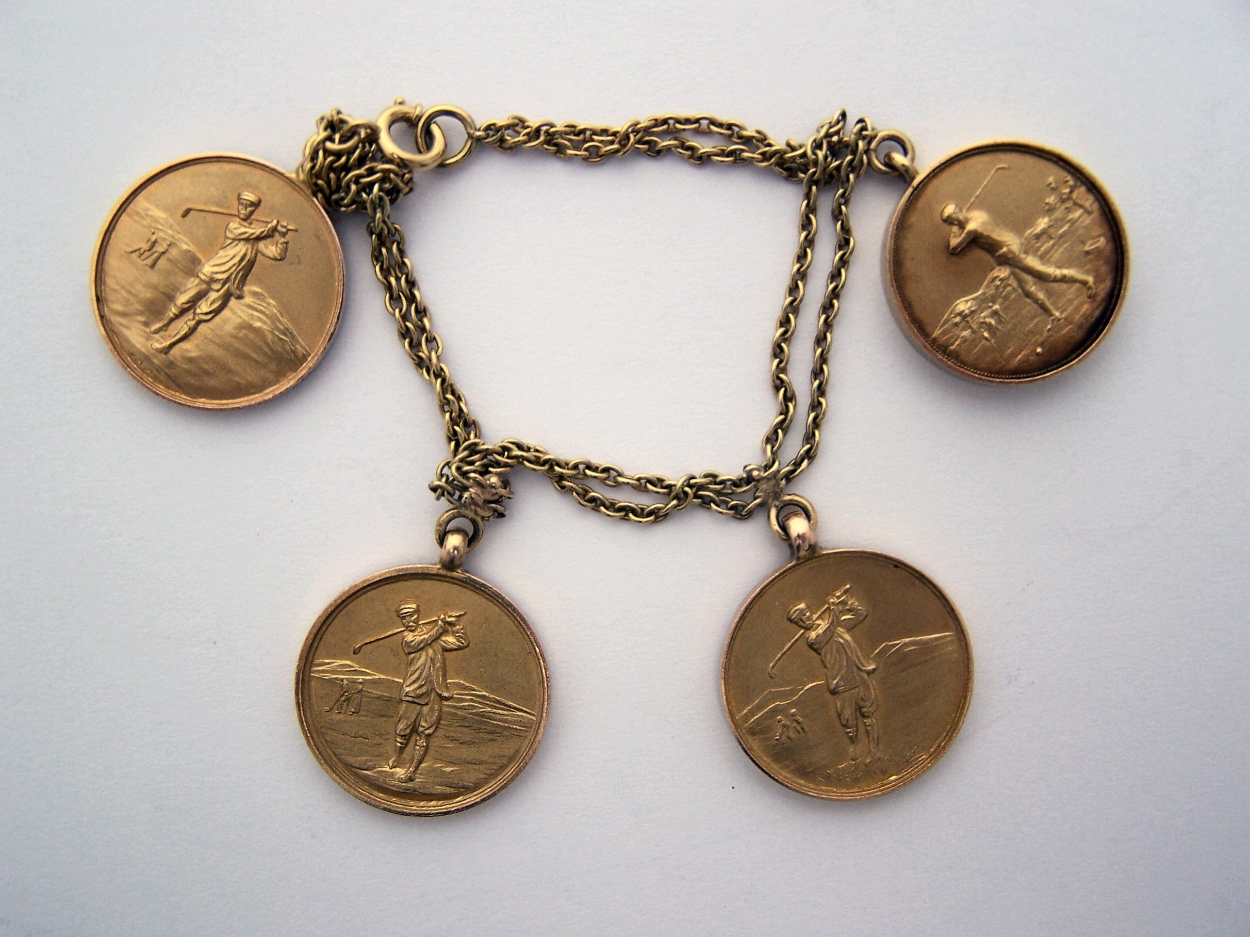 each with engraved armorials, and figure of golfer in mid swing, linked by fine trace chain