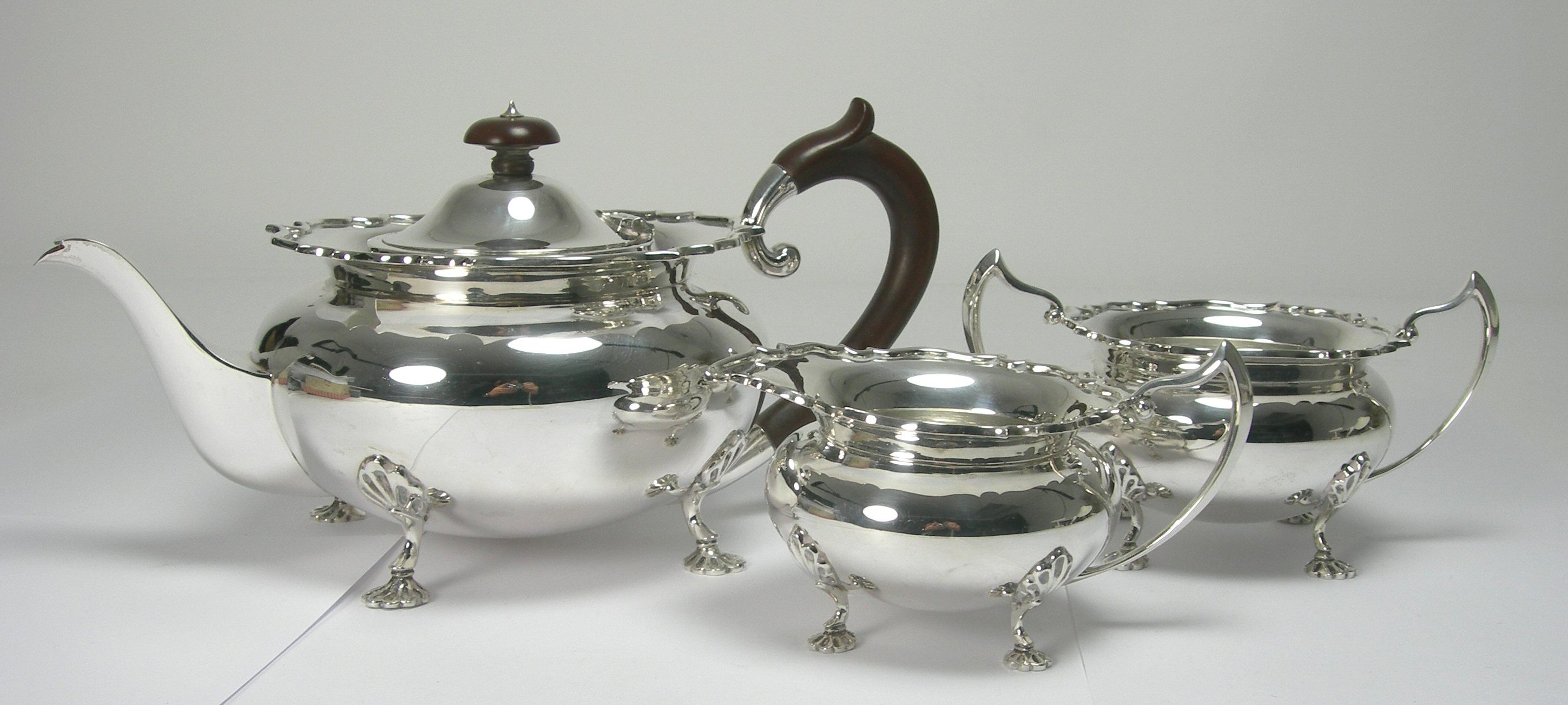 Martin Hall & Co, Sheffield 1927, comprising teapot, twin handled sugar bowl and cream jug, with baluster bodies with everted scalloped rims, raised on scroll feet with shell terminals (3)