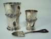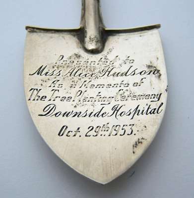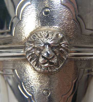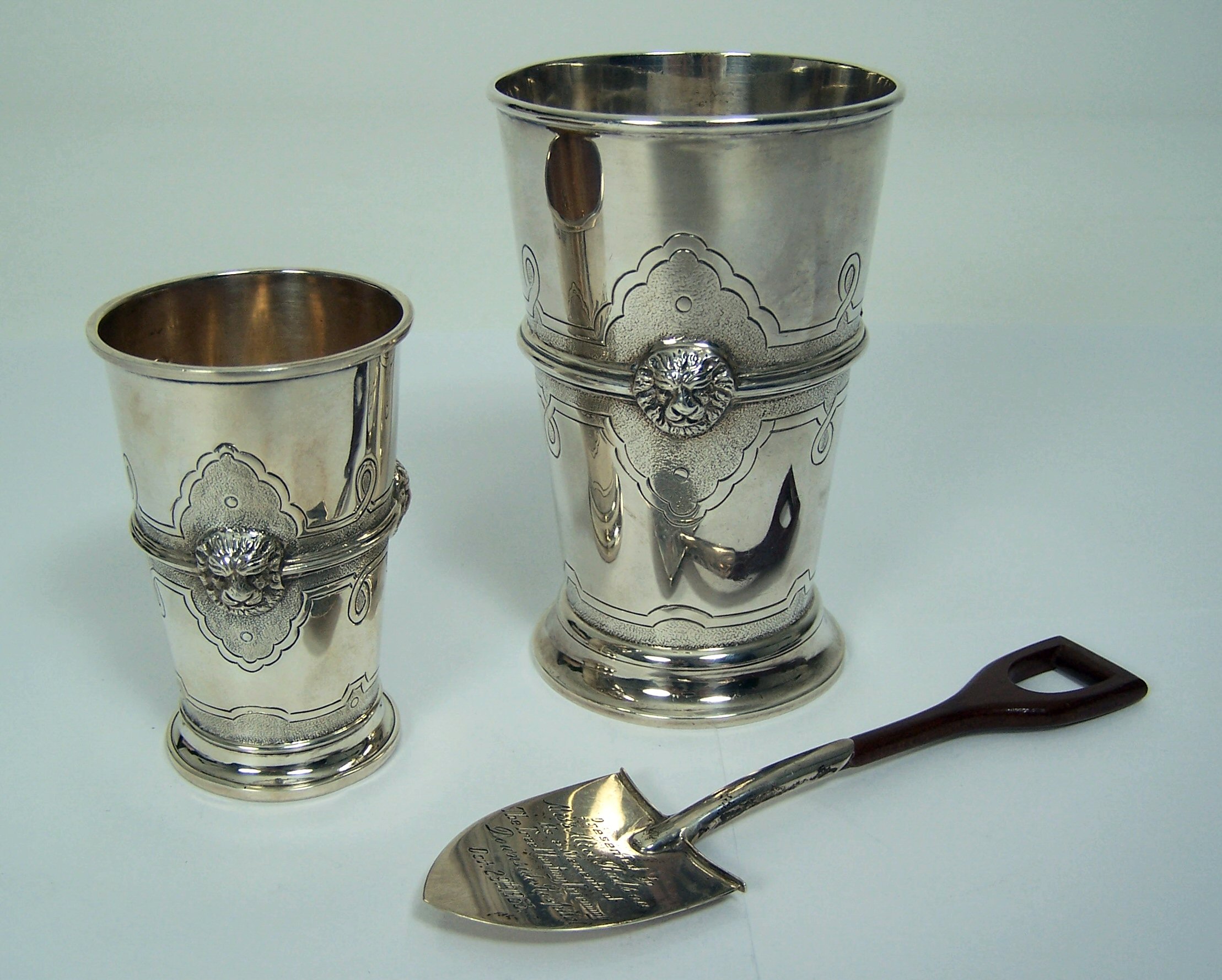 Birmingham 1935, of tapering form, applied lion's head masks, engraved strapwork, together with a small presentation spade