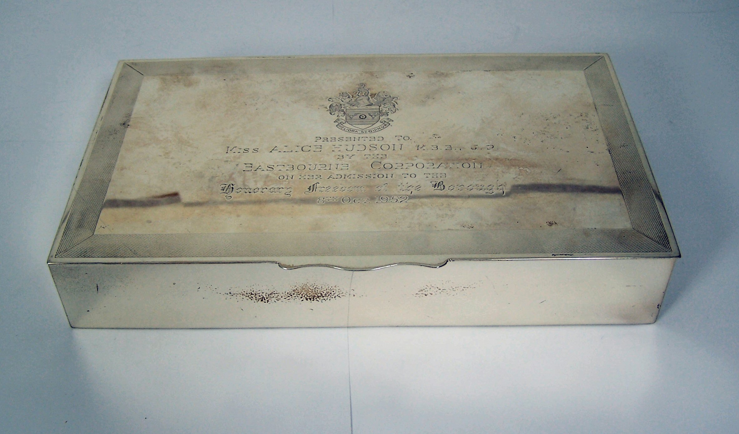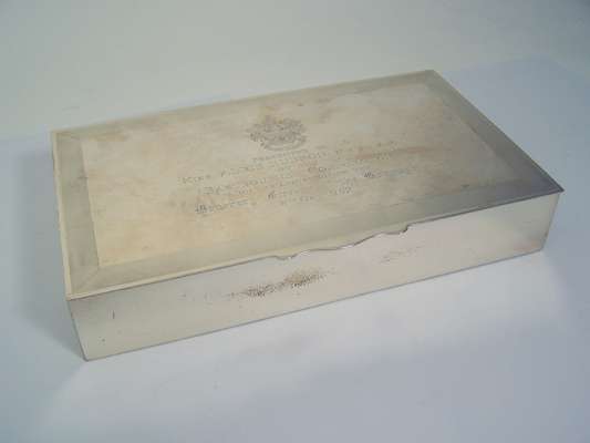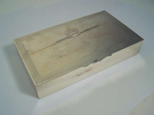 Samuel Mordan, Birmingham 1951, of heavy gauge, rectangular form, engine turned border, engraved armorials and inscription, cedar lined interior