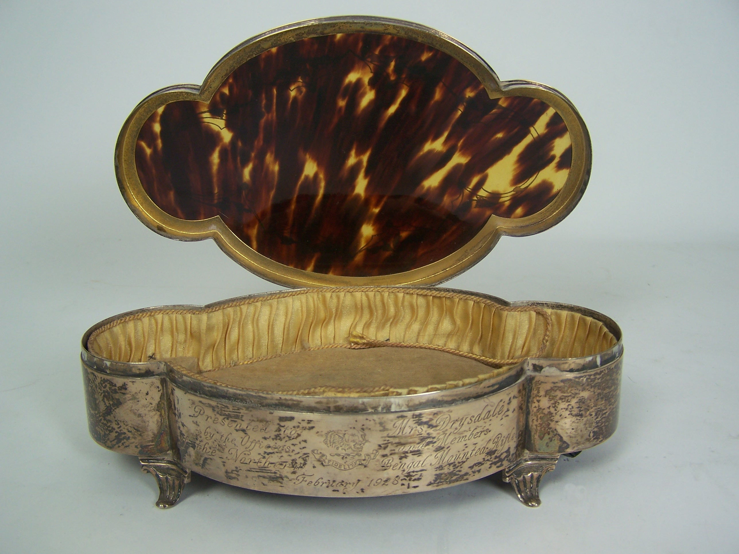 Adie Brother Birmingham 1922, retailed by 'Garrard of London and Calcutta', of quatro foil outline with simple straight sides, engraved with presentation inscription 'Presented to Mrs Drysdale by the Officers and members of the Northern Bengal Mounted Rifles February 1928' the hinged tortoiseshell cover with inlaid silver border of swags and foliate detail