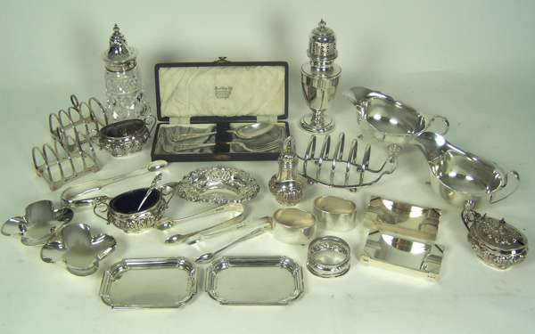 to include; a sugar caster with panelled body and pierced domed cover, Wilson and Sharp (of Edinburgh) Birmingham 1935; a pair of heavy ashtrays; a pair of small sauce boats; various toastracks; a three piece cruet etc (qty)