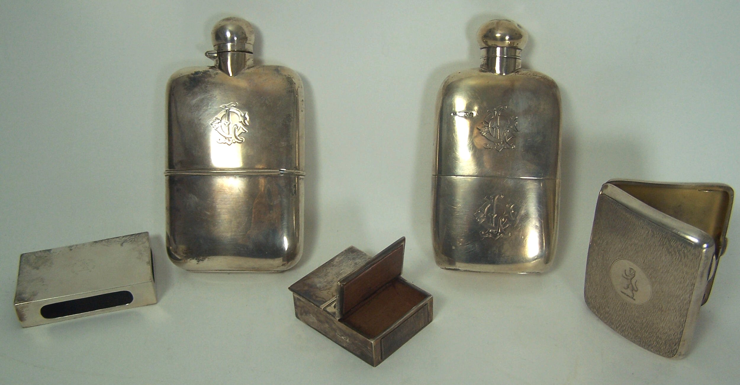 to include a large hip flask by Samson Mordant & company London 1927, of rounded form with pull off lower section; another similar example Chester 1902, makers mark indistinct; a cigarette case with engine decoration; a match box cover and a vesta box (5)