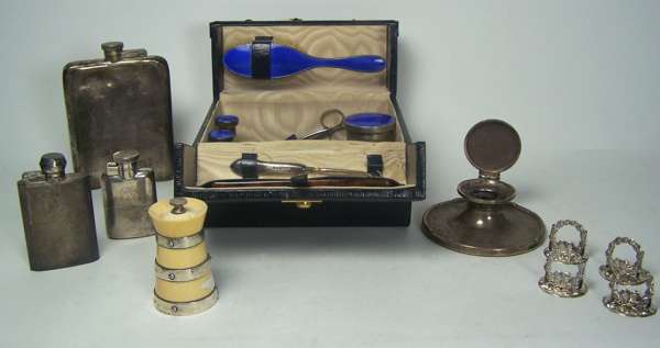 to include a leather dressing set by Asprey of london, with silver mounted jars, bottles and brush with deep blue guilloche enamel; an ivory pepper grinder with three applied silver bands; four menu holders with wreath supports; a large hip flask and two smaller examples and a desk inkwell (10)