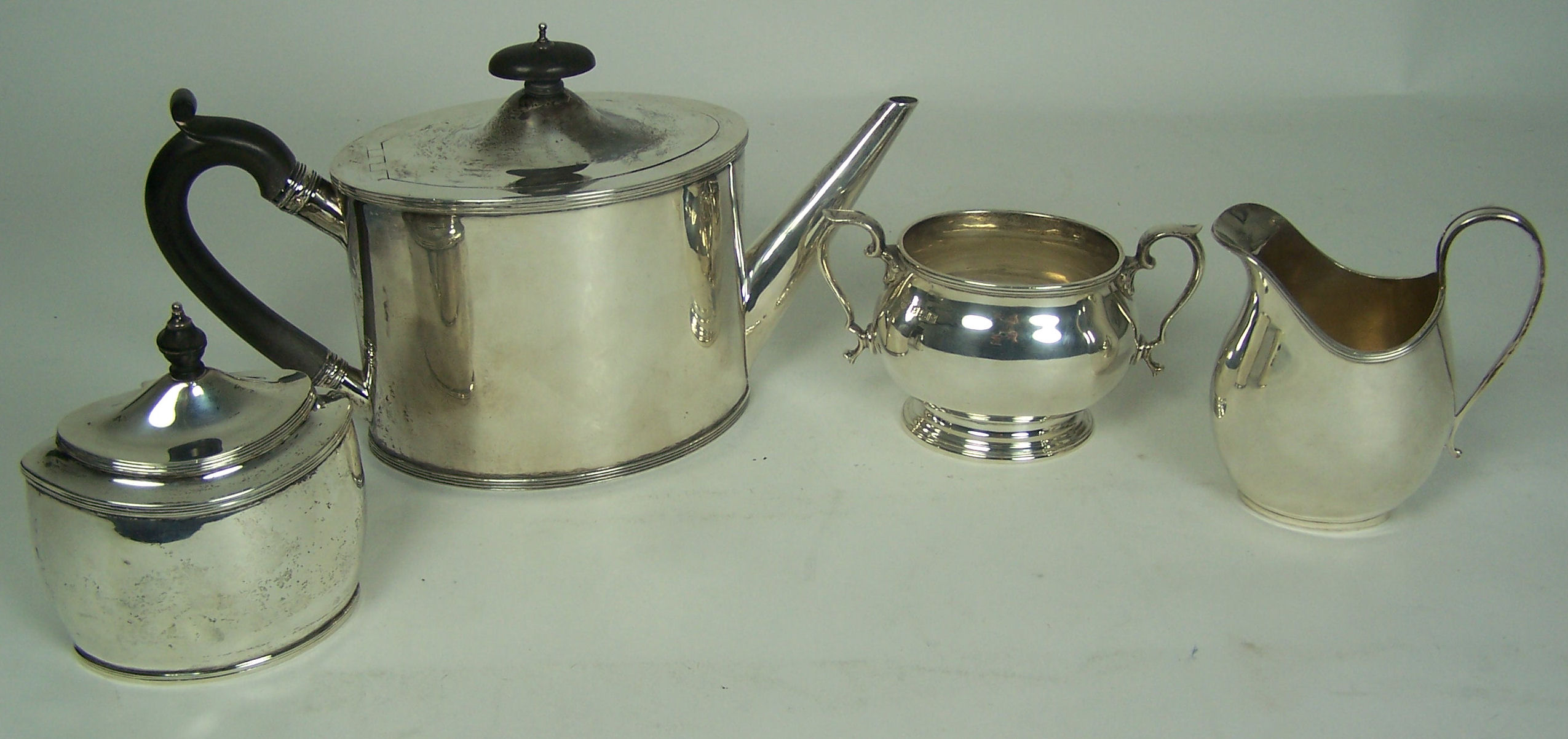 Vanders 1944, of simple oval outline with reeded borders and straight spout, domed hinged cover with wooden finial and flush hinged, with simple C scroll handle; together with a moder, helmet cream jug, twin handled sugar bowl and navette shaped tea caddy (4)