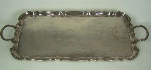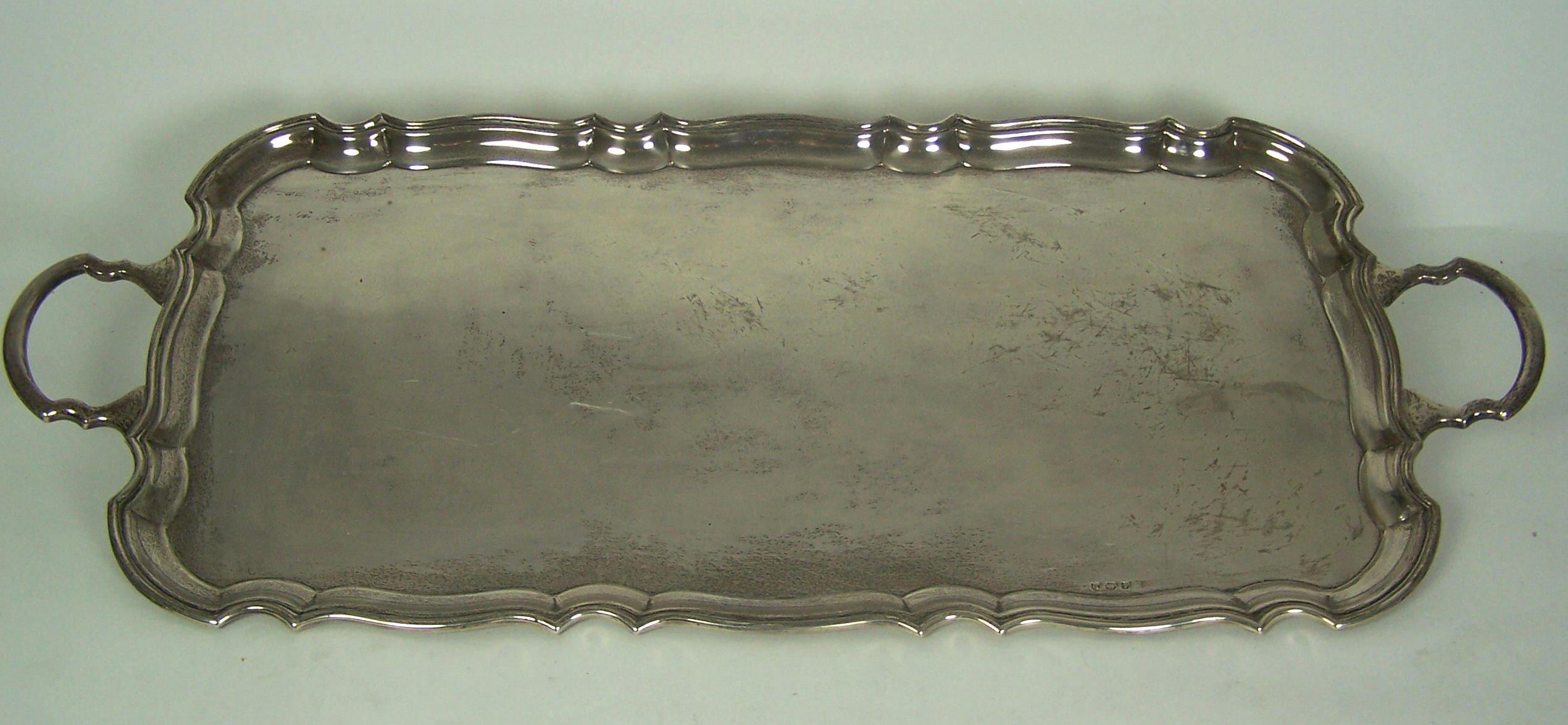 Birmingham 1928, of shaped rectnagular outline with scalloped everted border and twin loop carry handles