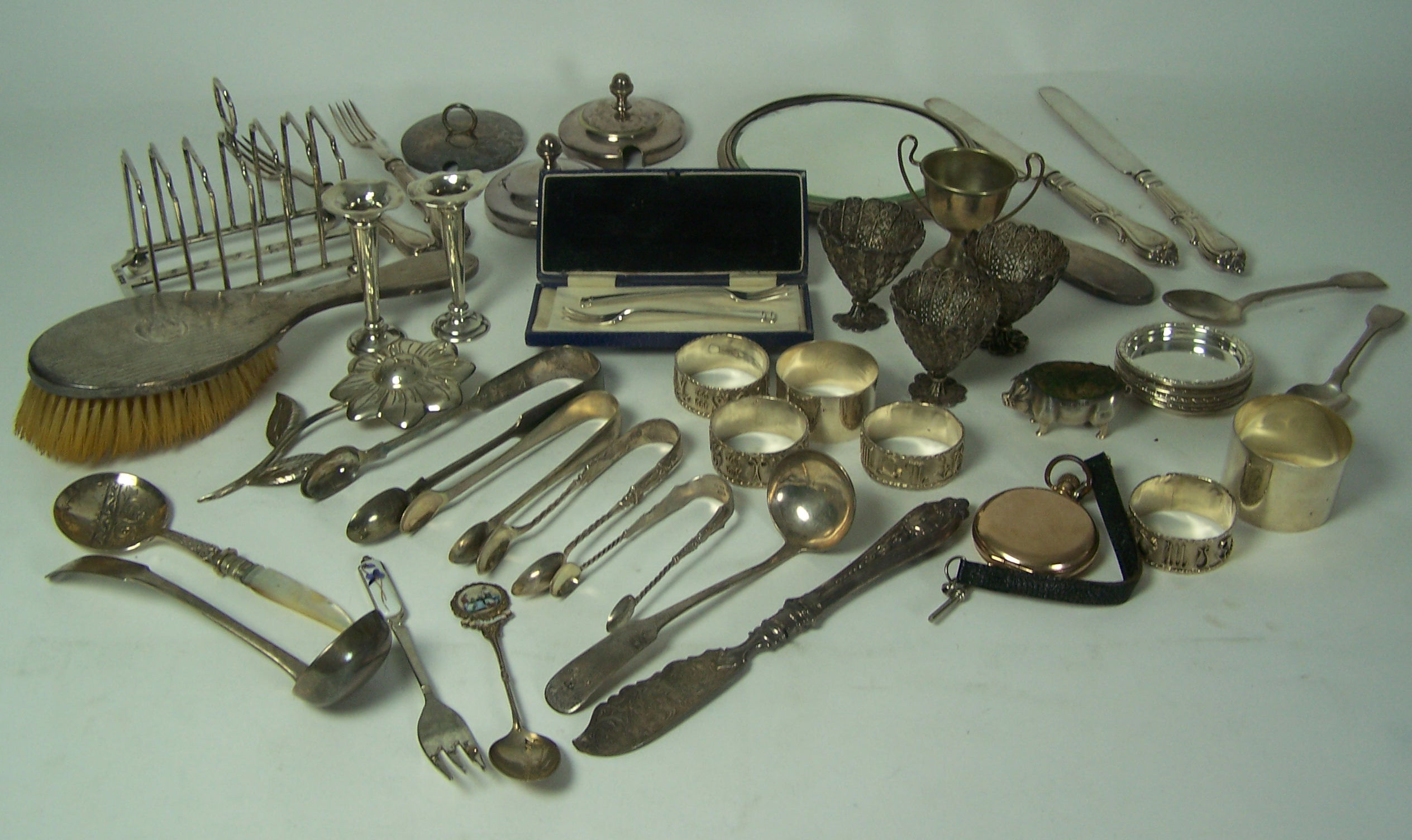 to include a set of Victorian fruit knives and forks, comprising twelve forks and six knives, of hour glass variant; a seven bar toastrack Sheffield 1911; two George III toddy ladles with Edinburgh marks; together with a collection of small silver and flatware (qty)