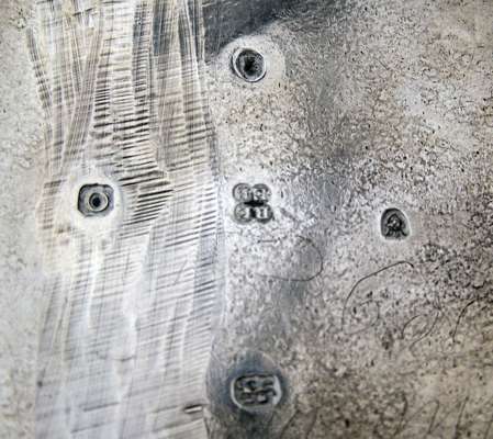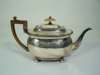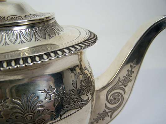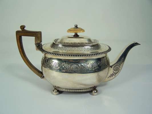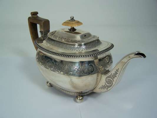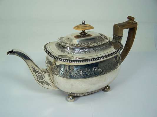 Rebecca Emes and Edward Barnard, London 1809, of rounded rectangular form engraved leaf and anthemion bands, stained wood handle, slender curved spout, all on ball feet