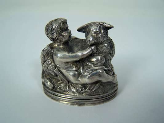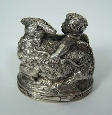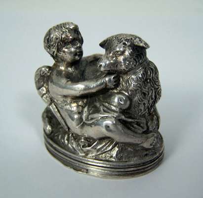 of oval form, modelled as a winged cherub and a lamb, gilt interior