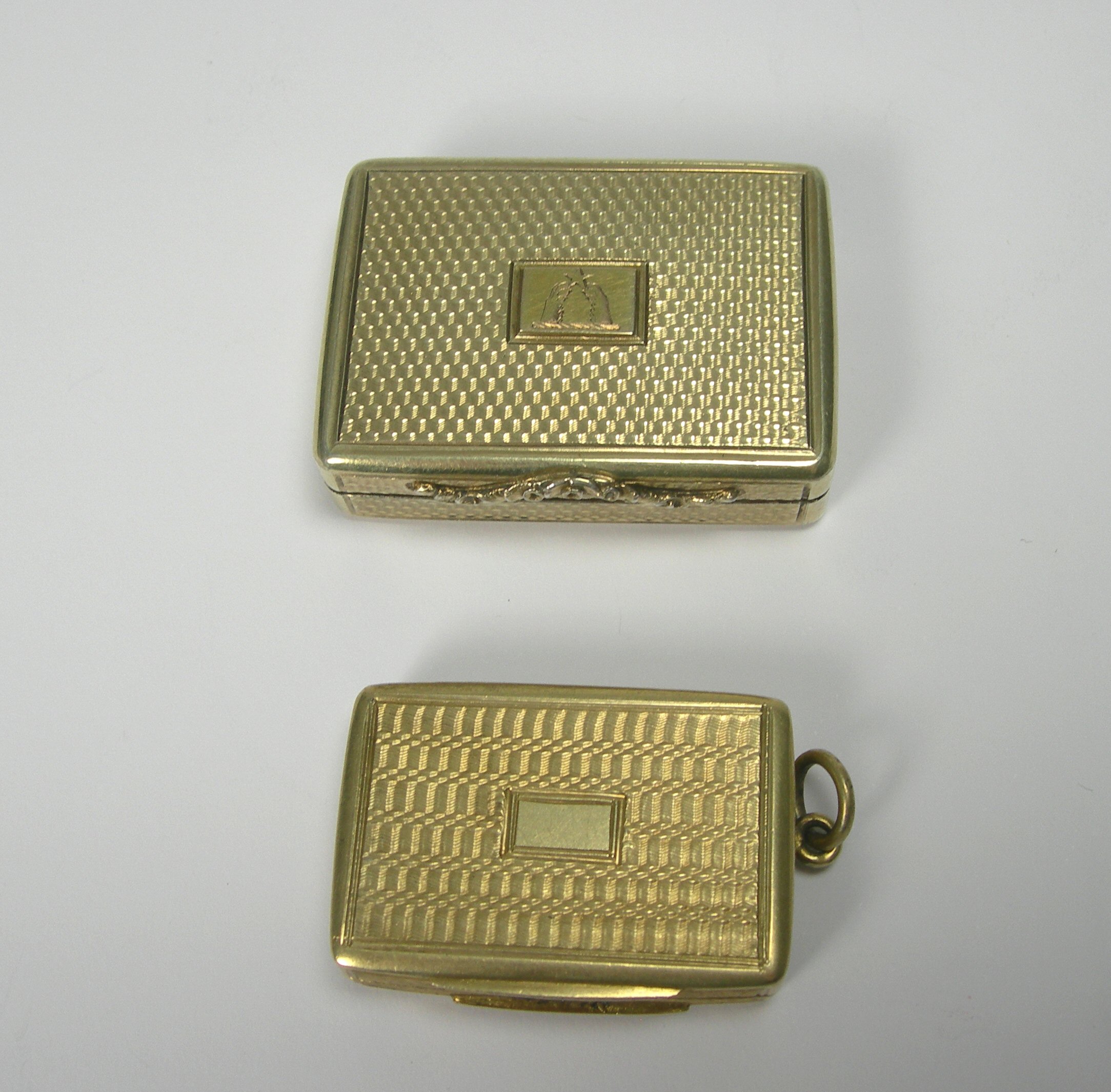 Nathaniel Mills, Birmingham 1838, of oblong form, engraved crest, engine turned, engraved grill, 4.5cm; another similar by John Barber Birmingham 1825, 3.5cm (2)