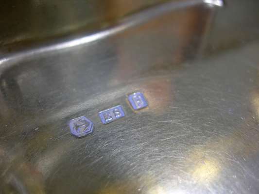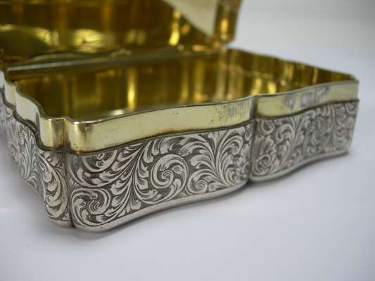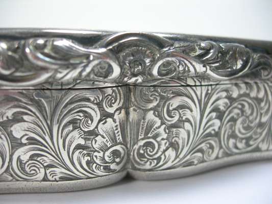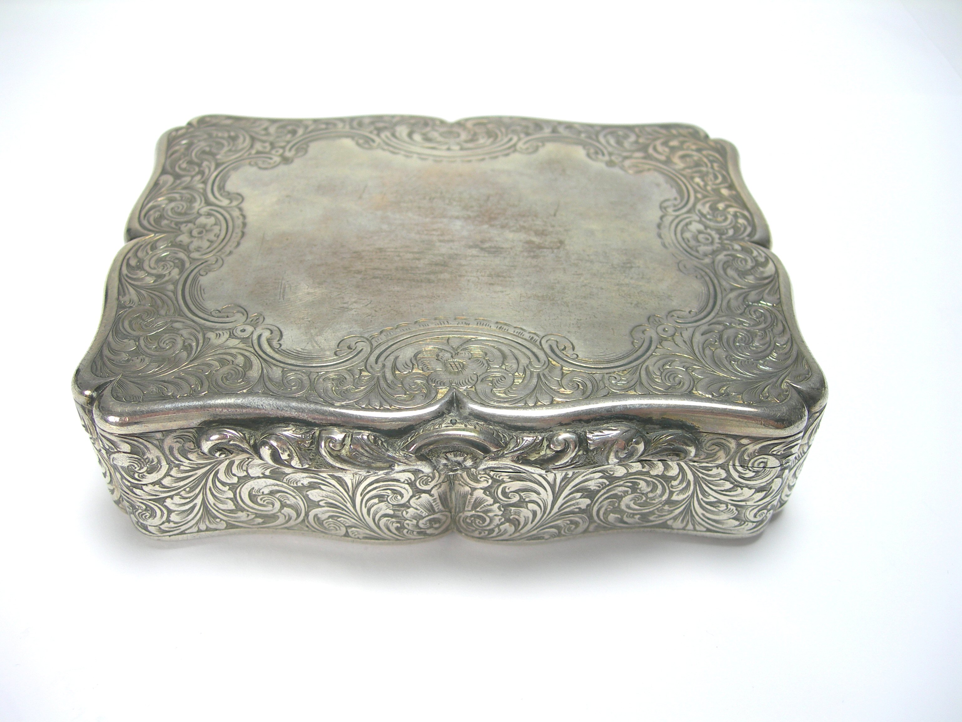 Edward Smith, Birmingham 1854, of oblong form with serpentine outlines, engraved floral decoration, blank cartouche, cast thumbpiece