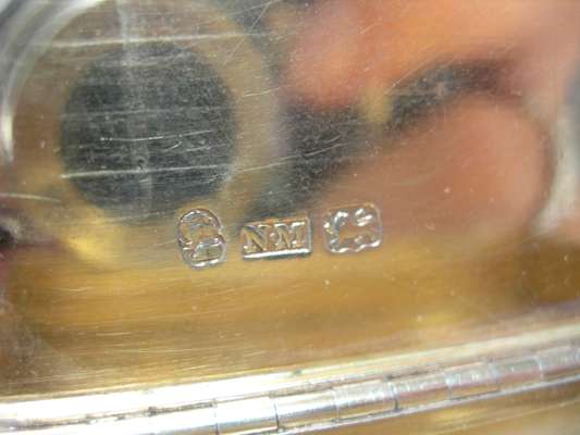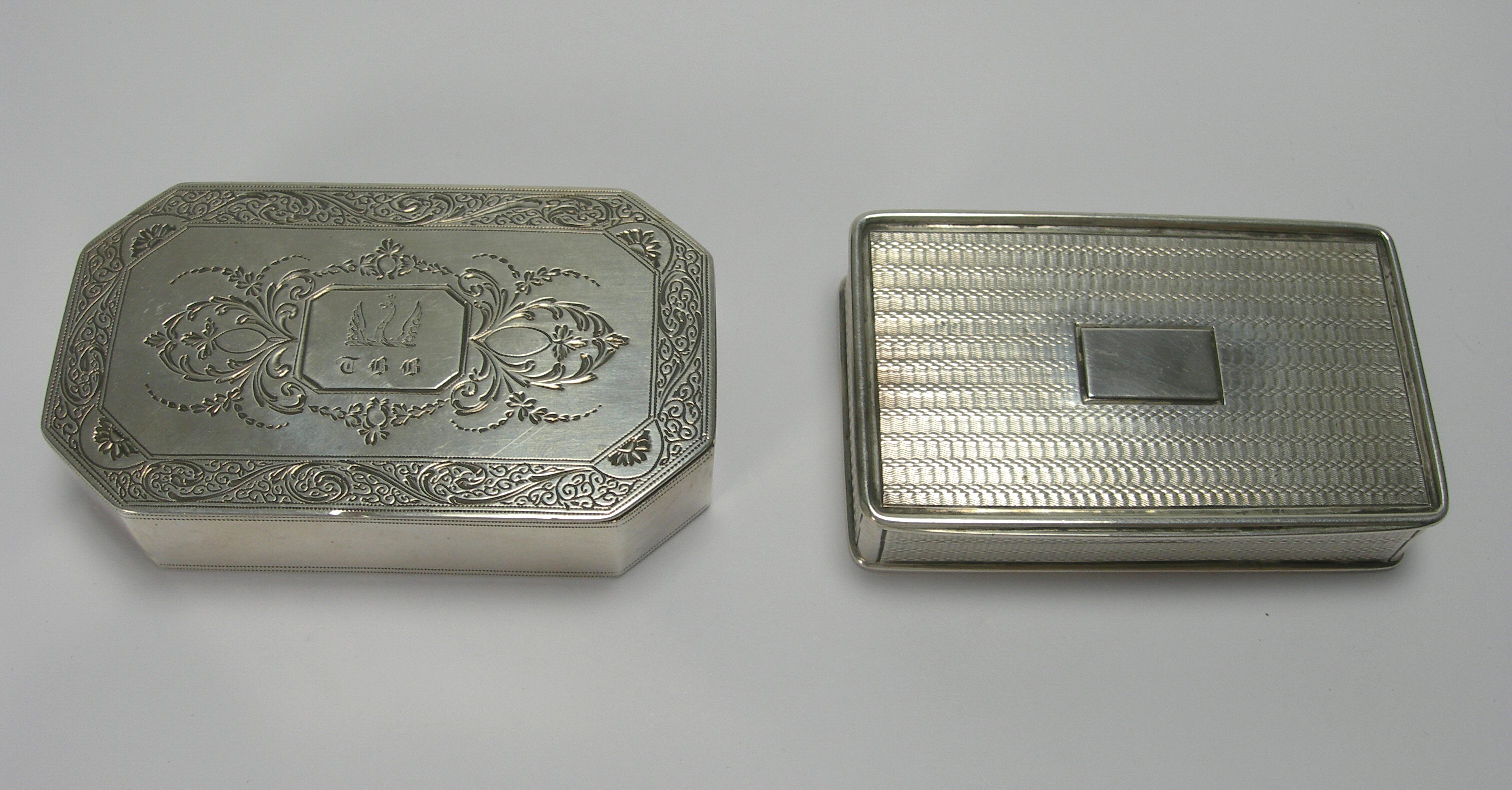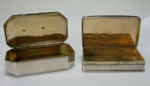 Nathaniel Mills, Birmingham 1834, 7cm; and another, with canted corners, engraved foliate borders and cartouche with an engraved crest, maker's mark R.B. London 1797, 8cm (2)