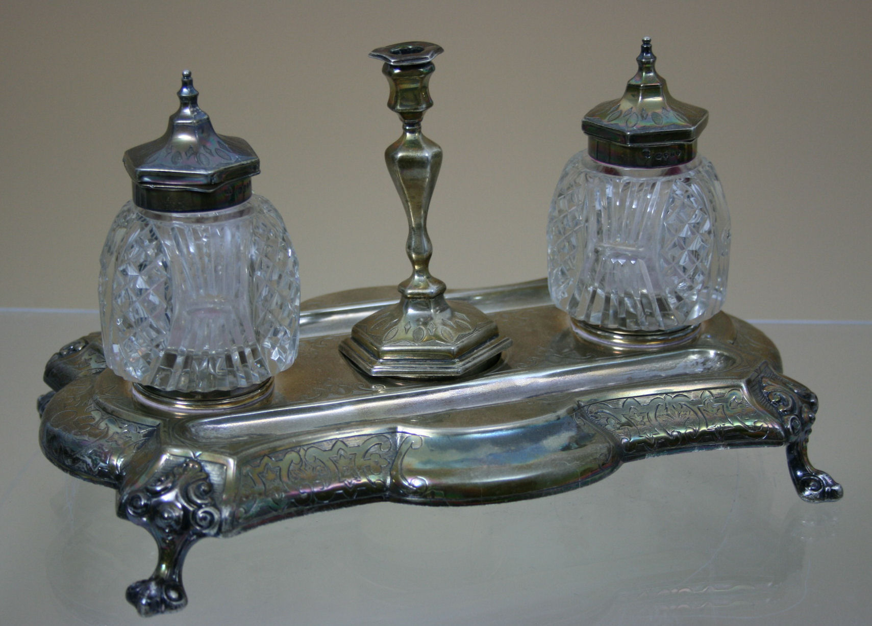Martin and Hall, London 1872, of rounded rectangular form, shaped border, engraved floral border and raised on scroll feet, two silver lidded glass inkwells, and a taper stick to centre