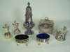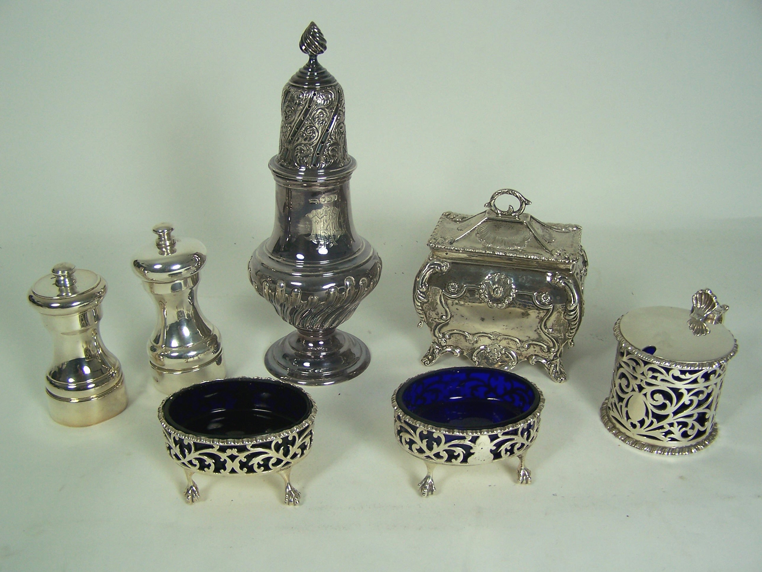 a large sugar caster by Walker and Hall Sheffield 1893, the baluster body with semi spiralled fluter lower section, the domed pull off cover with embossed scroll decoration and pierced detail; a pair of modern capstan pepper grinders; a pair of open salts London circa 1770, of oval outline with pierced gallery sides with reeded rim, on four claw and ball feet; a modern drum mustard pot with pierced scroll sides and bombe shaped tea caddy with embossed decoration (7)