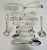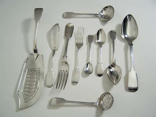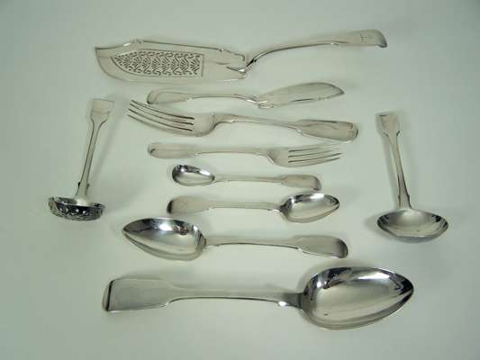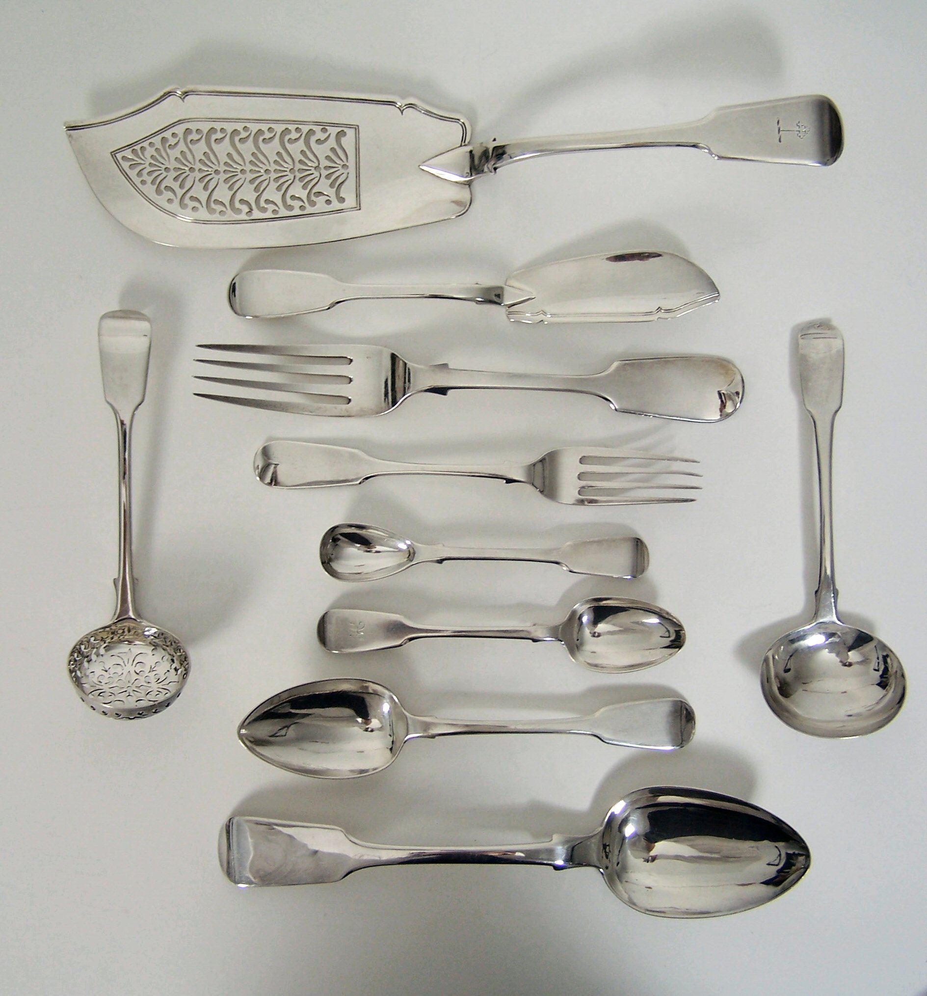 mixed dates and makers, fiddle pattern comprising eighteen each of; table forks; dessert forks; dessert spoons; teaspoons; eight serving spoons; two gravy spoons; a sugar sifter; two butter knives; a fish slice; six egg spoons (qty)