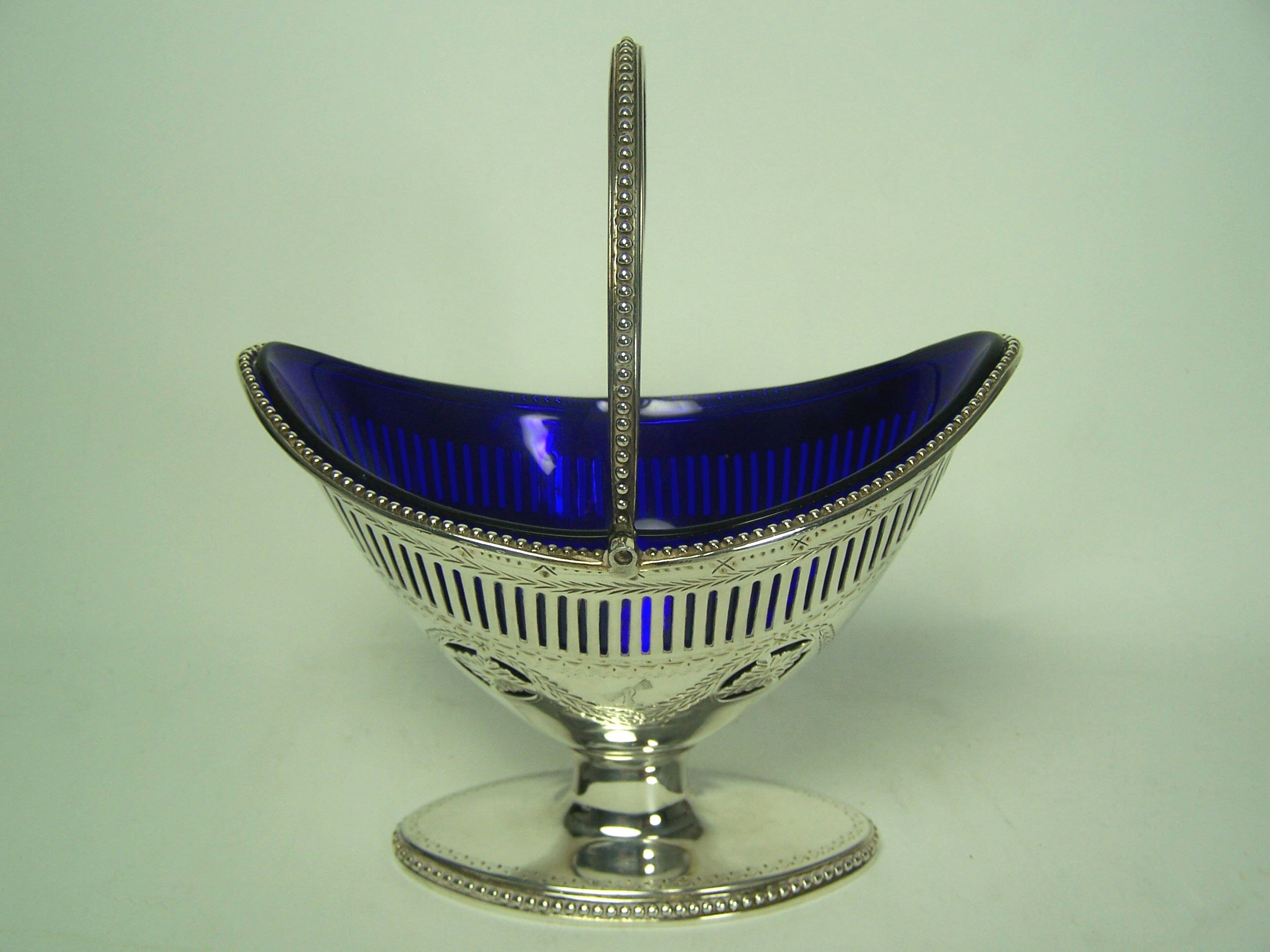 makers mark indistinct (possibly TD), london 1783, of navette outline, hinged swing handle and blue glass liner, with beaded rim the body with reticulated border with engrave swags bellow between pierced foliate detail, on oval foot with beaded border