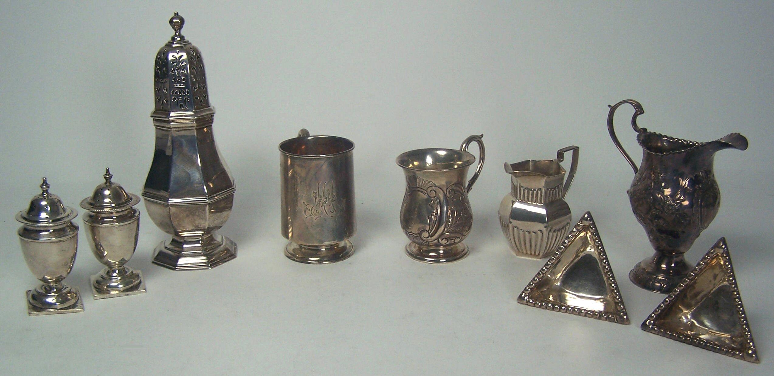 with London marks, of baluster form with embossed floral and foliate design, the rim with beaded details; an octagonal sugar caster with panelled body and pull of cover London 1935; together with a pair of vase shaped pepperettes, two small christening mugs, a pair of small Traprain salts and a cream jug (9)