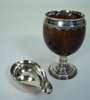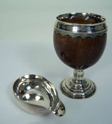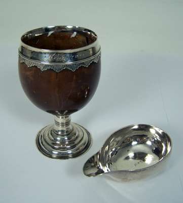 London 1772 (makers mark indistinct), of conventional form; together with an 18th century coconut cup, the mounts unmarked, the applied rim with engraved scalloped border, with waisted stem and spreading domed foot rim (2)