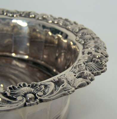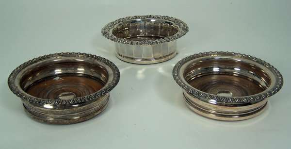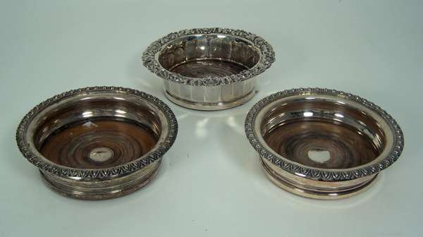 by IS & HW, Sheffield 1829, of circular outline with everted heavily scrolled foliate and shell border, with panelled sides and turned wooden base; together with a pair of old Sheffield plated examples with ovolo everted borders and ribbed sides with turned wooden bases (3)