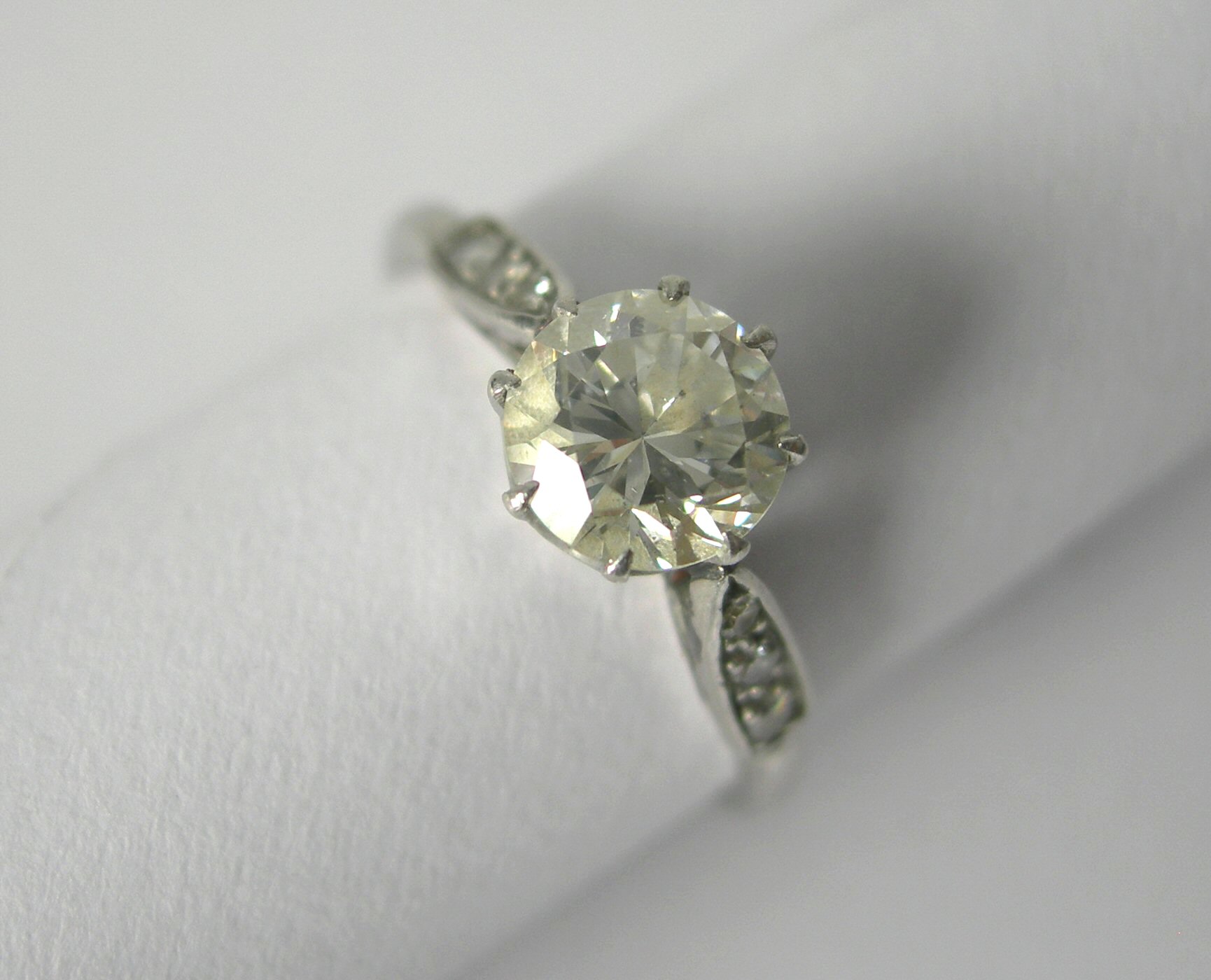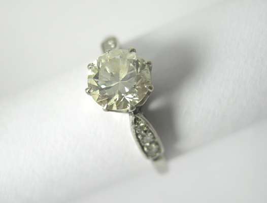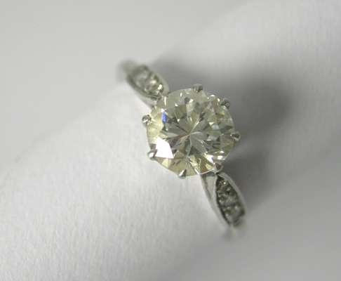 the central claw set round brilliant cut diamond flanked to each shoulder by three smaller round brilliant cut diamonds