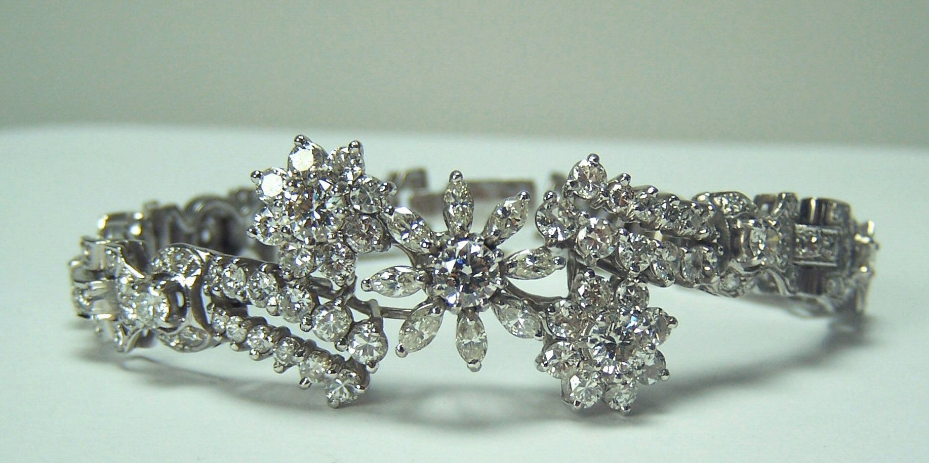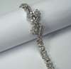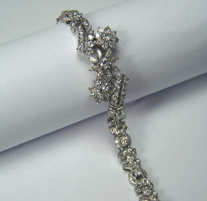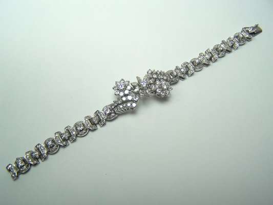 set throughout with round brilliant, marquise and single cut diamonds, the front designed as three diagonally set floral clusters flanked to either side by pierced geometric links