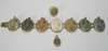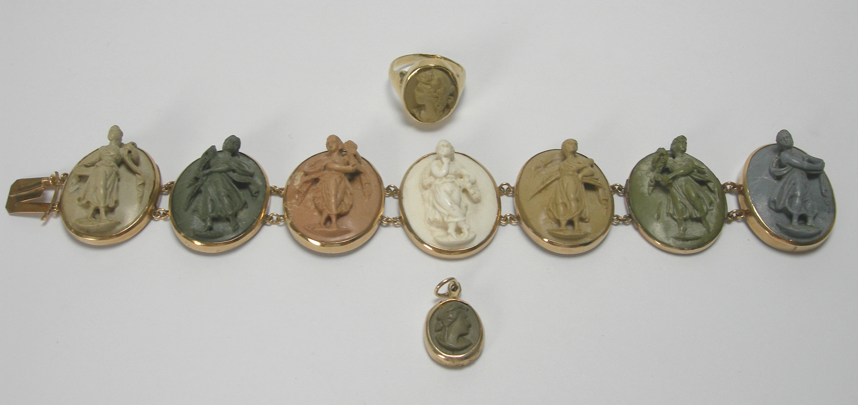 the seven ovals of various colours, carved as classical dancers; together with a gold ring, set with a carved oval lava cameo; also an ear drop (3)