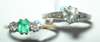 the central claw set trap cut emerald flanked to either side by an early round brilliant cut diamond; also a diamond single-stone ring, additionally set to each shoulder with two single cut diamonds (2)