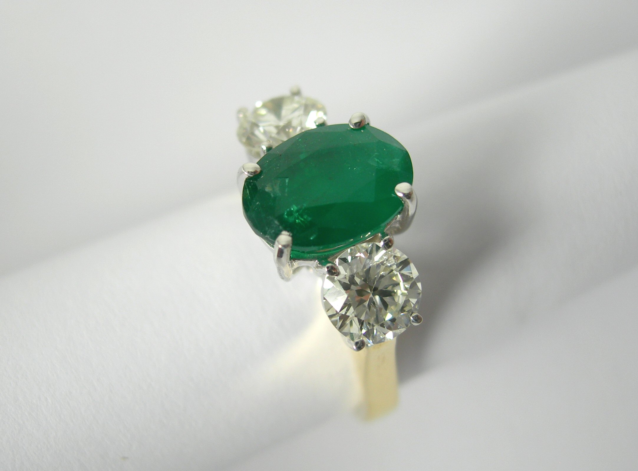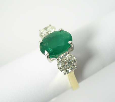 the central claw set oval cut emerald flanked to either side by a round brilliant cut diamond