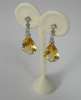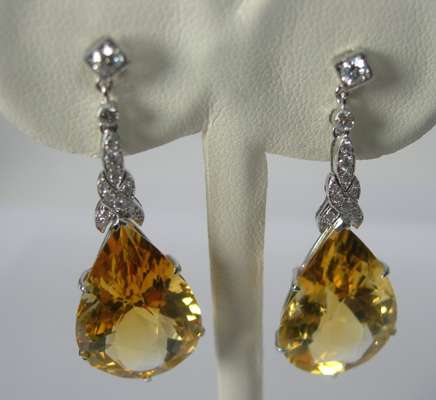 each with millegrain box set round brilliant cut diamond surmounting a tapering scroll set with graduated similarly cut diamonds, suspending a large pear cut citrine drop, mounts stamped 750